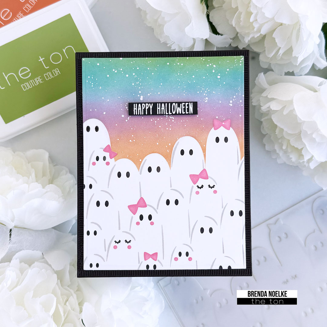 I used some pot-it-notes to help block some of the ghosts while ink blending the background. For the gradient background I used Peach Puff, Lime Twist and Deep Sapphire. For the shadow on the ghost I used Crystal Pewter. For the bows I used Lavender, Deep Blush, Peach Puff and Rouge. Sentiment from Postage: Fall Sentiment set. Finish by splattering some white inks and adding some white dots to the ghost eyes.