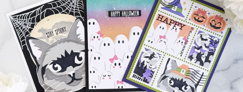 Hi friends. Happy Halloween! Vera here as we closed off the month of October. Since it’s Halloween it’s only appropriate that I share a couple Halloween cards. For my first card, I am showcasing Ghosts & Bow Layering Stencil set. I mean, come on… how adorable are these ghosts?