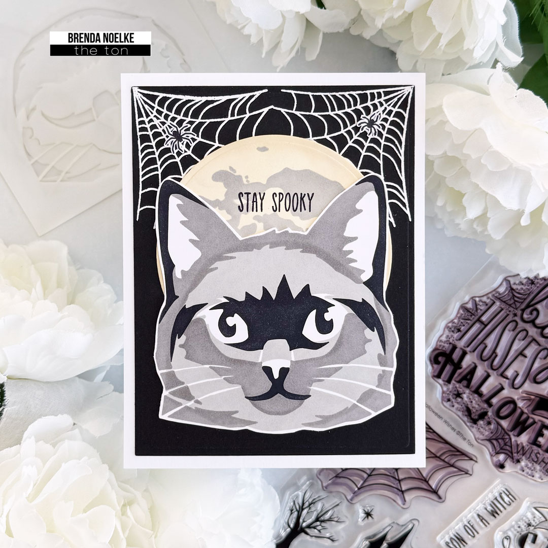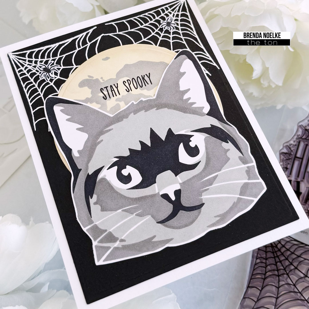 For the background, I die-cut a panel of black cardstock with the second largest die in the Rectangle A2 Nested Die Set. I white heat embossed the spider web in the Halloween Wishes Stamp Set onto the top two corners, then adhered it to a white A2 card base. I used one of the dies in the Circle Nested Die Set to cut the moon from white cardstock. I blended Vanilla Frosted Cupcake ink onto the circle, then used a stencil from the Super Moon Stencil Set with Crystal Pewter ink to add in the details. The sentiment is also from the Halloween Wishes Stamp Set. It was stamped onto the moon with Noir ink. The spiders, from the same stamp set, were stamped onto white cardstock with Noir ink and fussy cut. Everything was adhered with liquid glue and this card was finished.