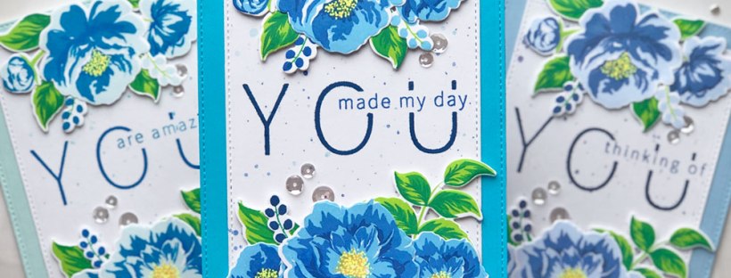 I selected a cardstock to match the lightest blue ink, then cut it and a piece of white cardstock with the Double Stitched Rectangle Dies (Large). The “YOU”, from 2d. Ed. Fill It In Sentiments, was stamped in the darkest ink and the smaller words in the middle color. The white panel was splattered with diluted inks in the lightest and medium colors of ink. The peonies were arranged and popped up with foam tape.