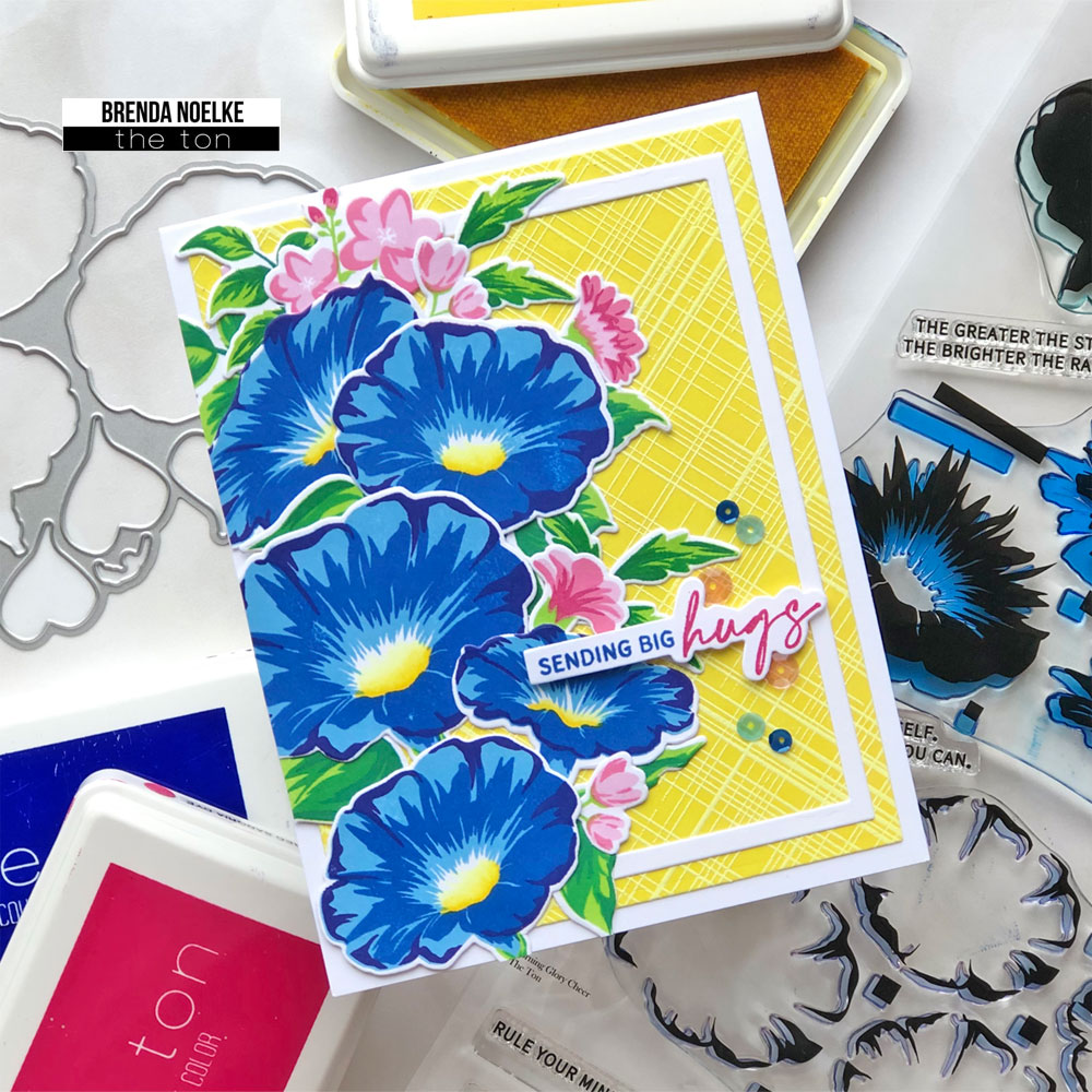 I began by stamping the images in the Morning Glory Cheer Stamp Set with Cali Blue, Azurite and Violet Fringe Inks, then cut them out with the Coordinating Dies. (I added some yellow to the centers of my morning glories with Copic markers.) The Bountiful Leaves were stamped with the Crystal Garden Collection and cut with the Coordinating Dies. I also stamped Floral Bits with the Ruby Collection and cut those out with their Coordinating Dies.