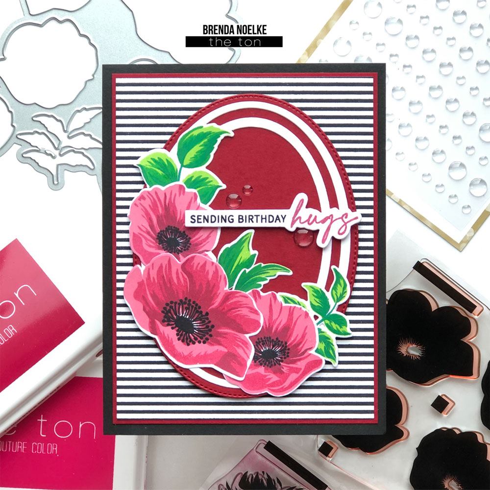 Created by Brenda with our Poppy Wishes stamp, Easy Expressions Birthday Stamp, Double Stitched Oval Nested Dies, Oval Frames Slim Borders Coverplate die, Bountiful Leaves, Minor Stripes Cling Background, Couture Color Inks (Soft Garnet, Red Sangria, Lipstick Red, Crystal Garden Collection, Noir) and Dew Drop Clear Enamel Dots.