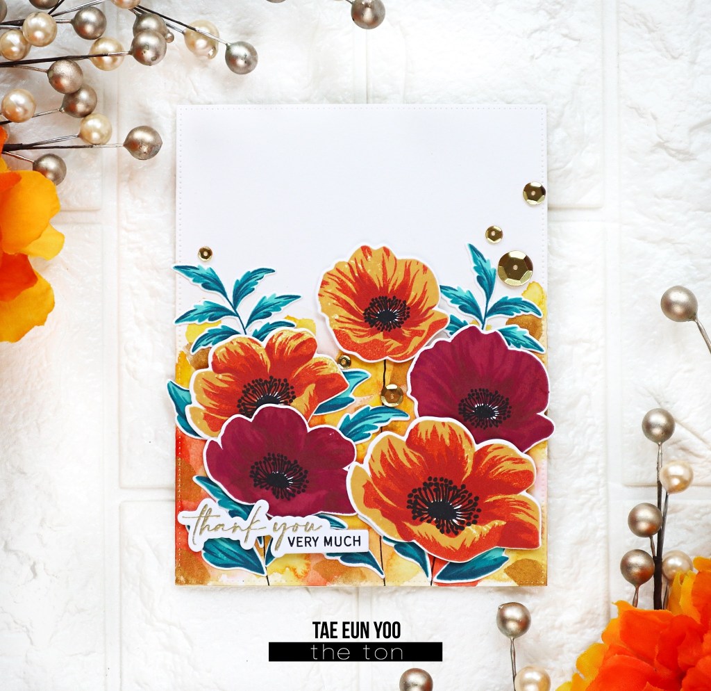 Created by Tae Eun with our Poppy Wishes stamp, Easy Expressions, Couture Color Inks (Amber Citrine, Coralline Hybrid, Coral Cavern, Lipstick Red, Pink Derby, Spiced Chai, Bright Emerald, Hot Tourmaline, Ocean Teal) and Medallion Gold Sequins.