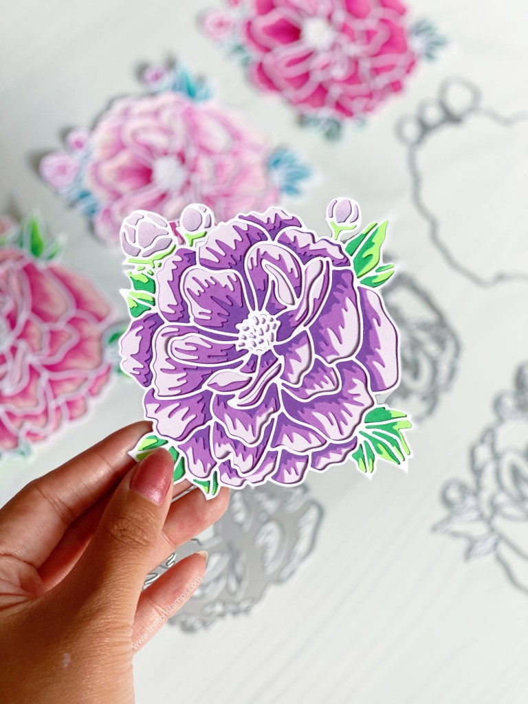 Our new Lovely Peony standalone layering dies can be layered to create a beautiful floral die cut. Use this assembled die cut as an embellishment for your papercrafts! Assembled peony measures approximately 4 x 3.75 inches at its widest points.