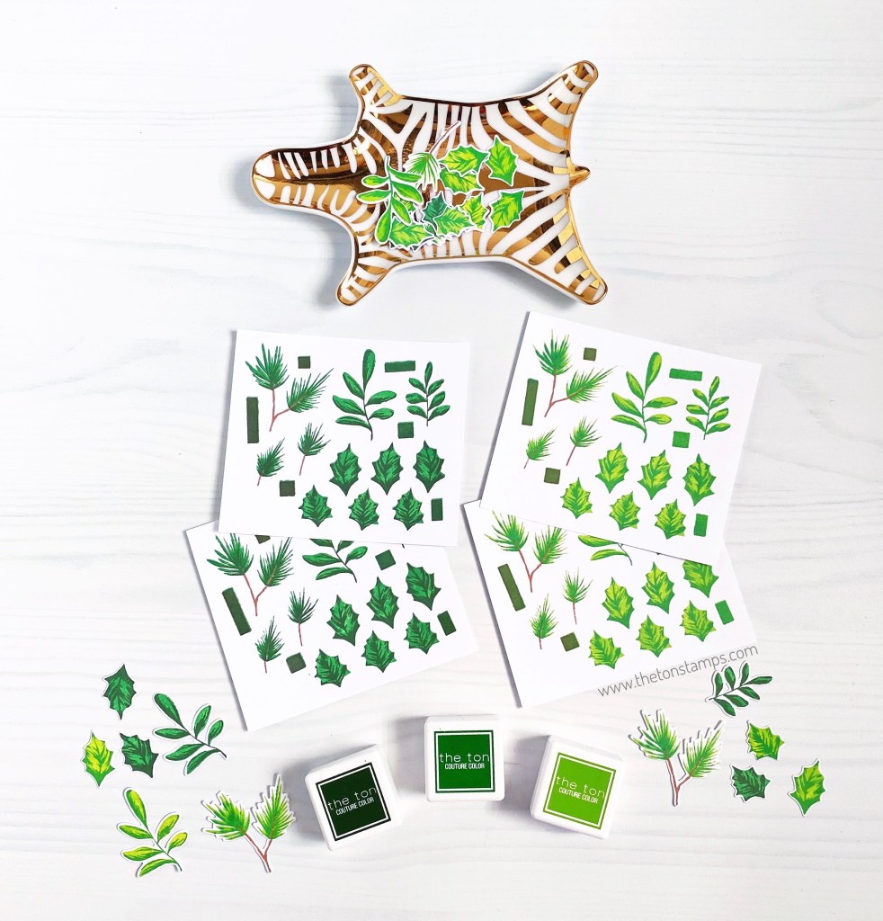 This is mainly a two step grouped layering set. There is a small third layer stamp to add the stamping for the branches of the pine sprigs. These two step layering sets take much less time to stamp and in the end, you are able to produce a nice quantity of foliage bits for your stash.