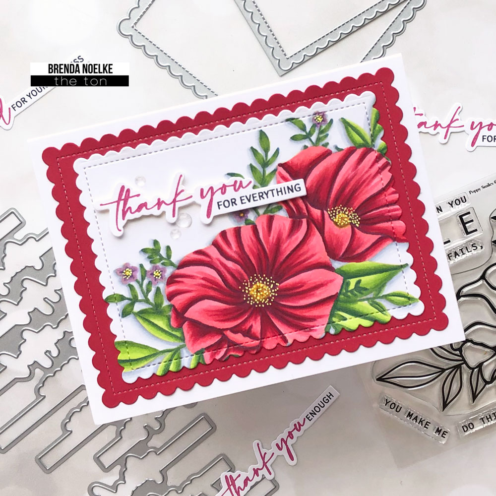 I die-cut the panel with the second largest die in the Scalloped Nested A2 Dies, then cut a panel of red cardstock with the largest die in the same set. I layered the scalloped panels onto an A2 size cardbase. For the sentiment, I stamped the Easy Expressions Thanks set onto white cardstock using Red Sangria and Noir inks, then die-cut them with the Coordinating Die. The die-cut sentiment was popped up with foam tape and I added some Dew Drop Clear Enamel Dots for a little shine!