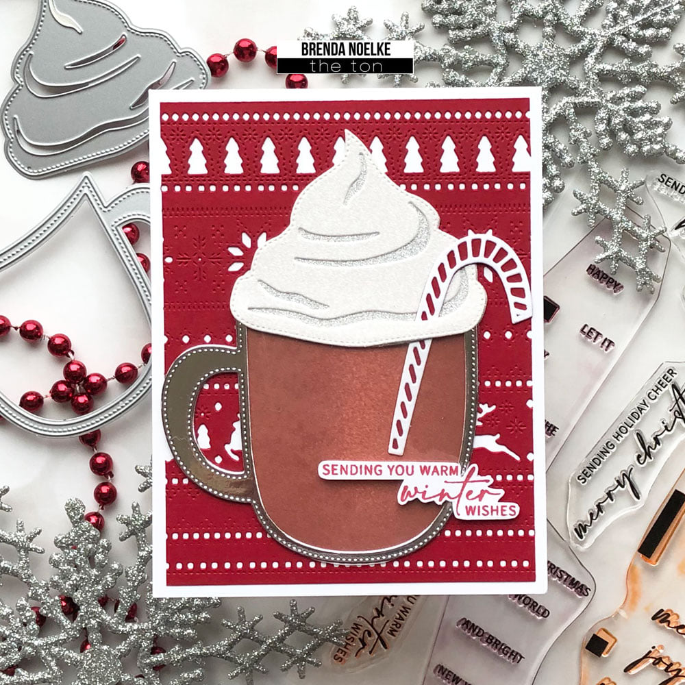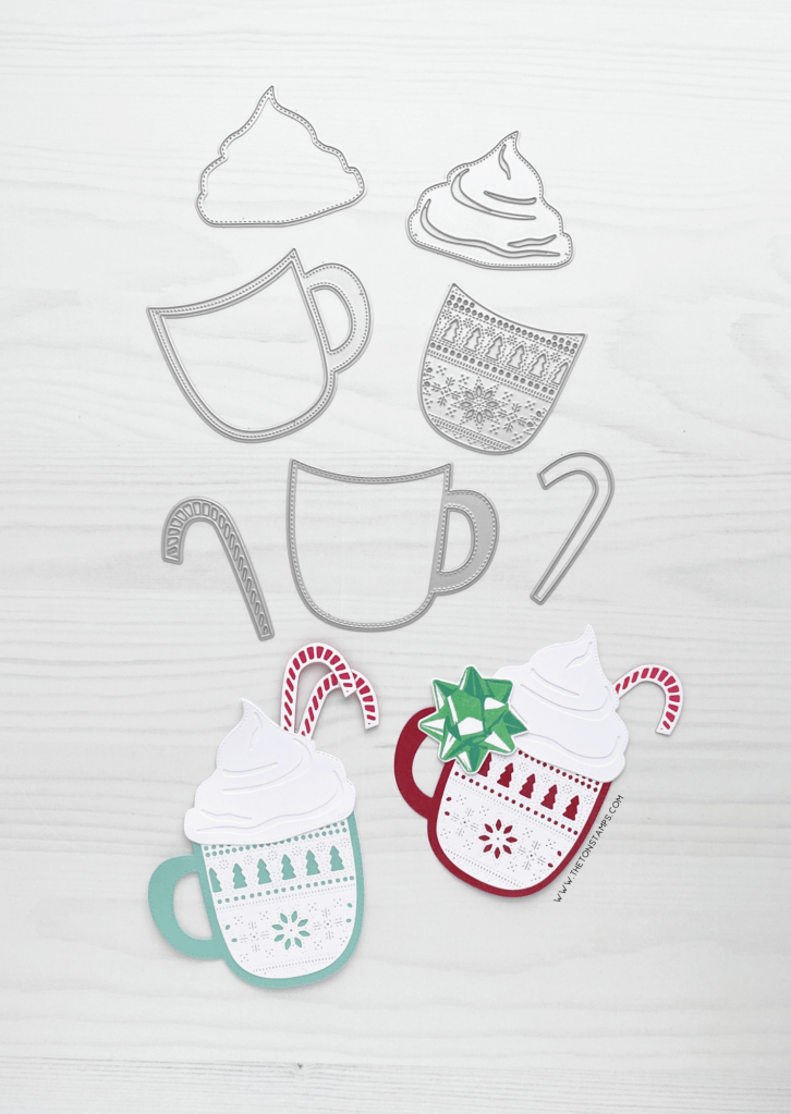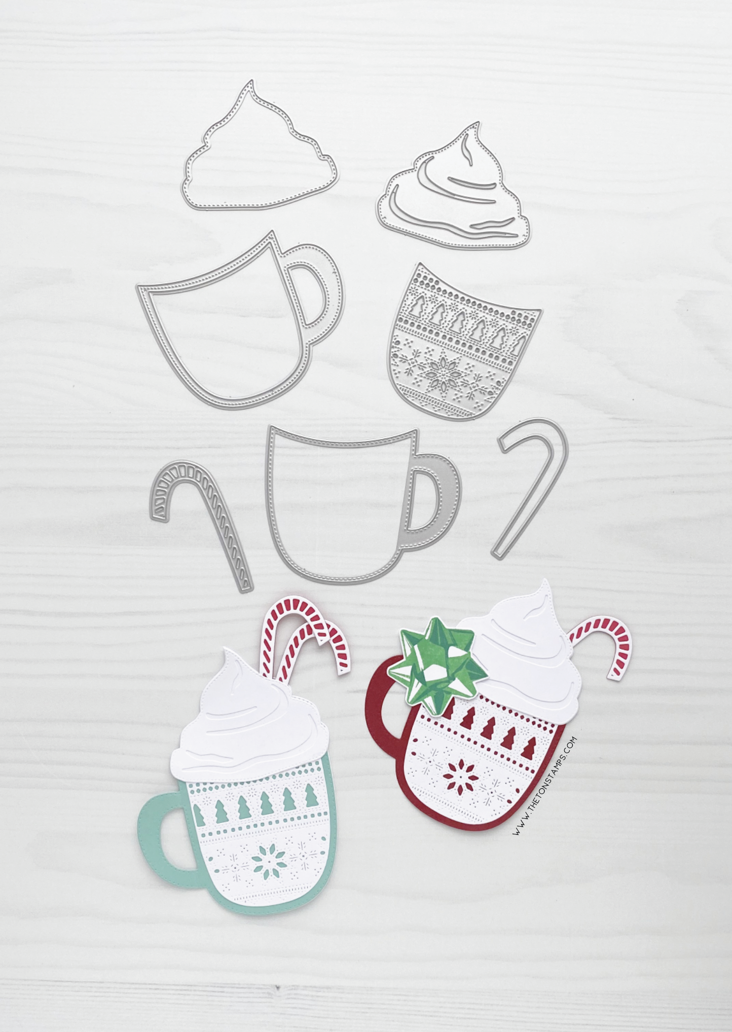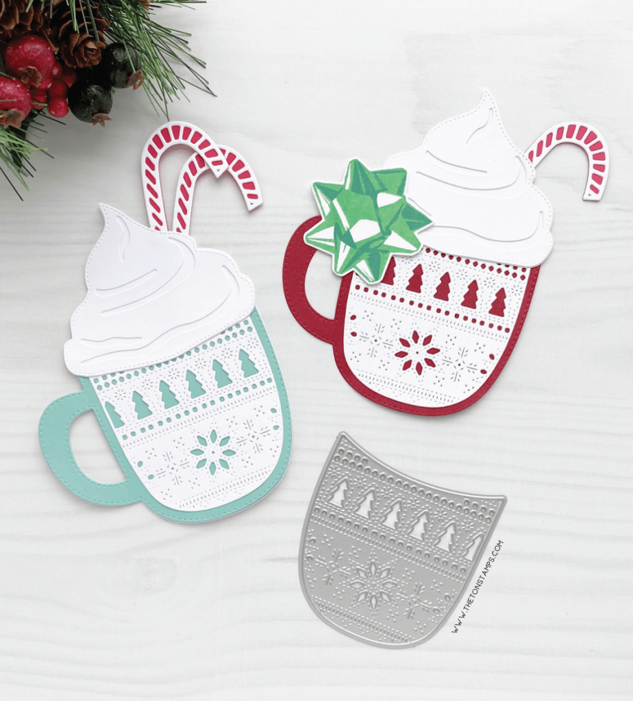 This adorable die collection is fun to assemble and comes complete with layered whip cream and candy cane dies and even a nordic patterned sweater cover die for the front of your coffee mug die cut.