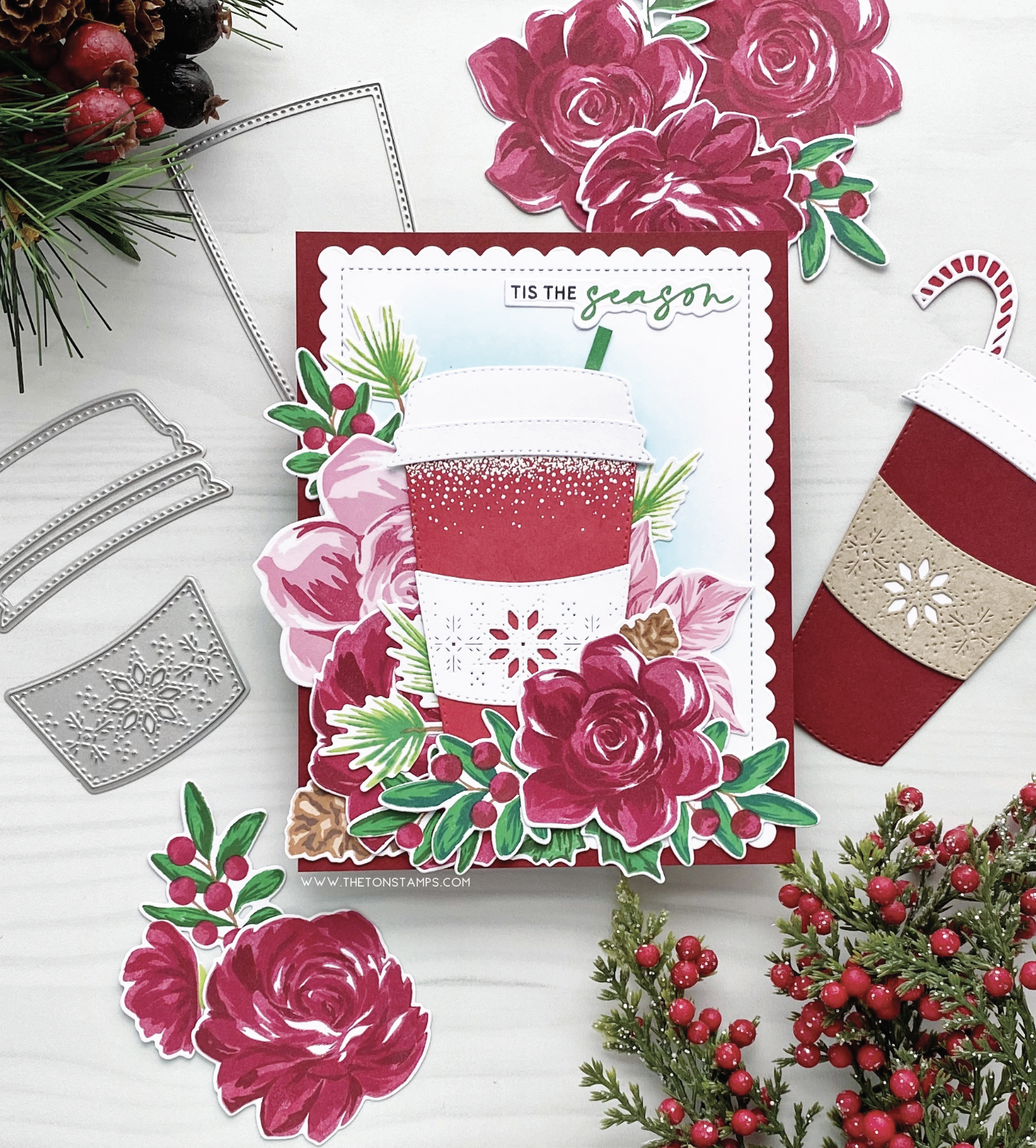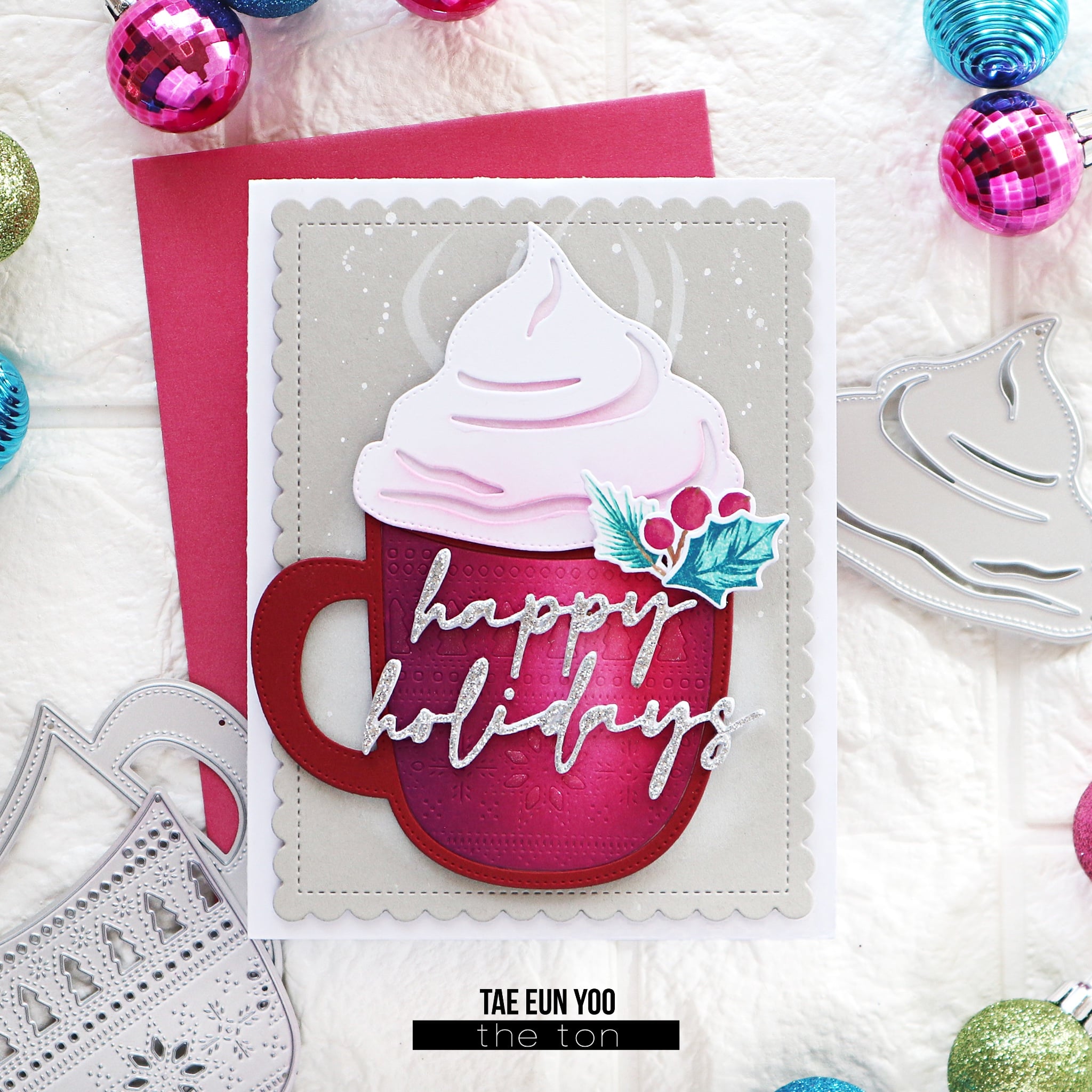 Created by Tae Eun using our Christmas Mug Dies, Scalloped A2 Nested Dies, Many Holiday Sentiments Dies, Winter Foliage Stamp and Berry Branches stamp.