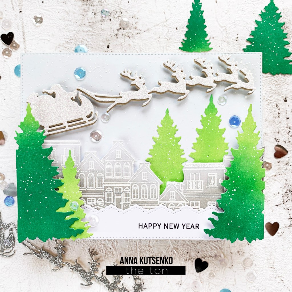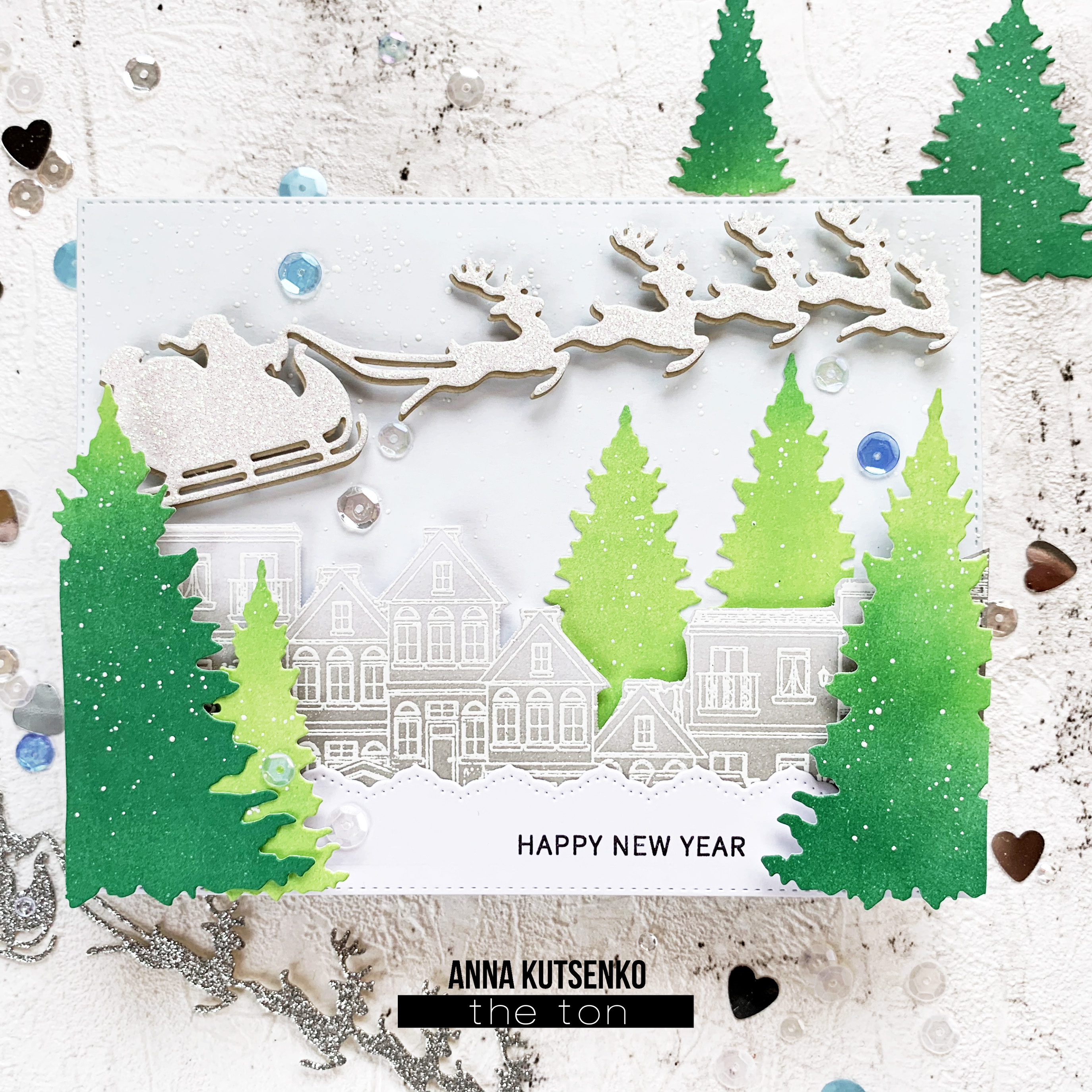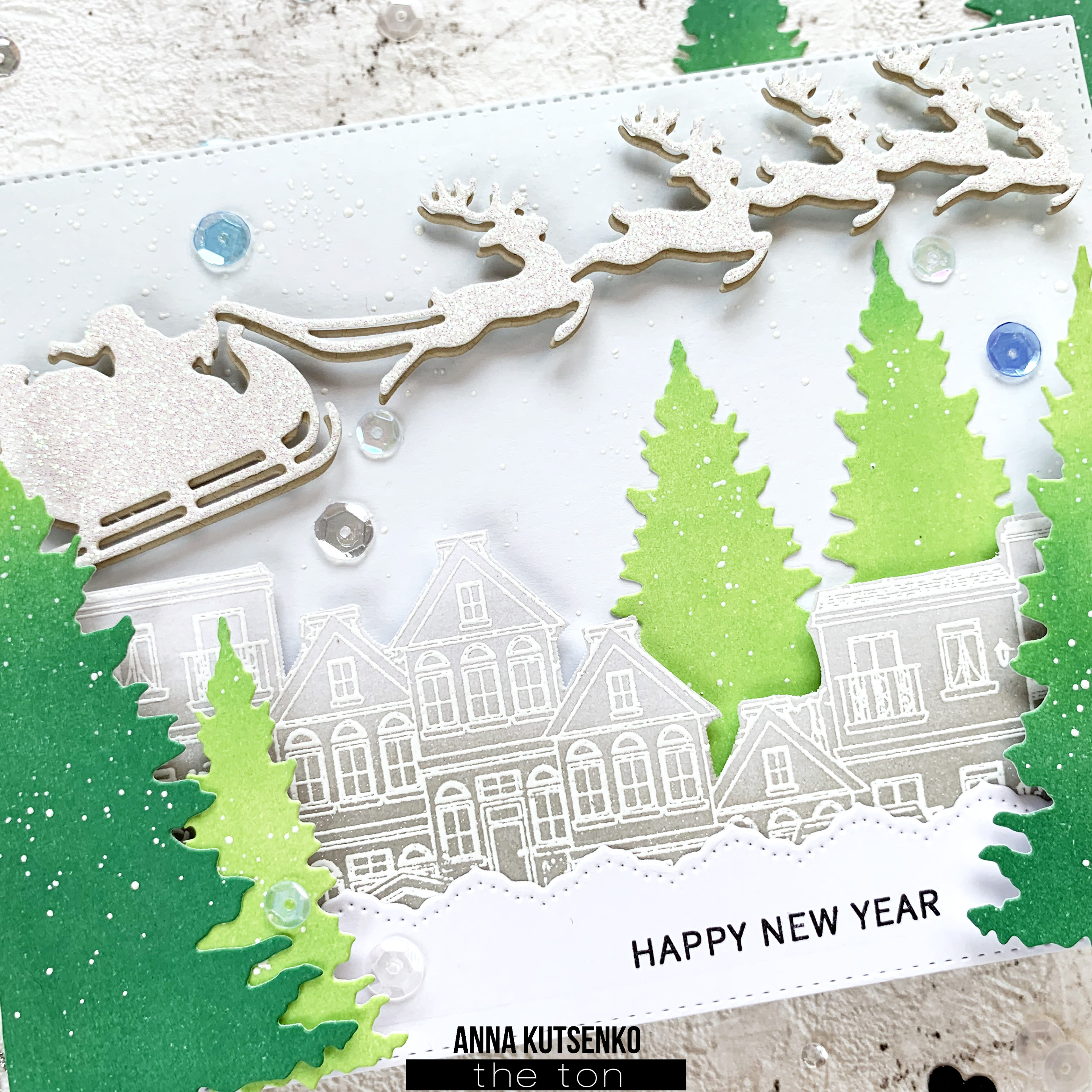 I began by die cutting Santa’s Sleigh from white glitter cardstock and from kraft cardstock (it’s for shadow). Then I ink blended Crystal Pewter on a piece of white cardstock, stamped City Buildings Cling Background, heat embossed in white and fussy cut it. To create pine trees, I ink blended Soft Garden and Deep Emerald on a piece of white cardstock and die cut them all with Pine Tree Cover Die. I added some white Embossing Enamel on them. To make a white border, I used SLIMLINE – Border Dies. The sentiment from Winter Foliage was stamped in Noir.