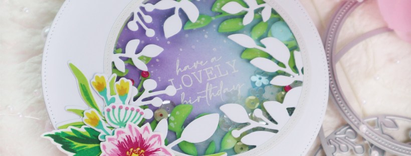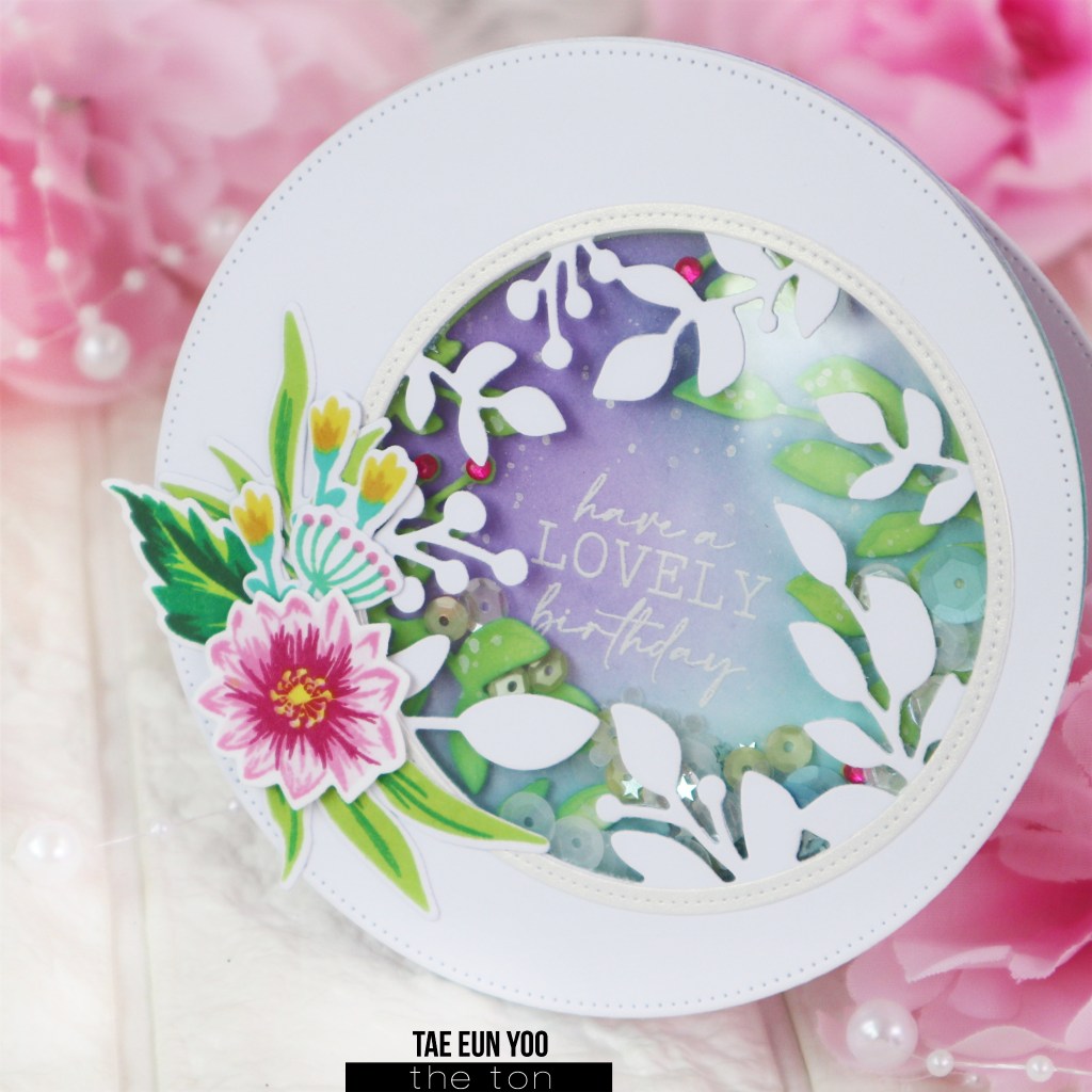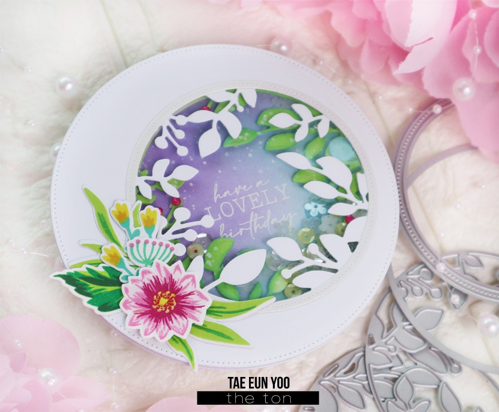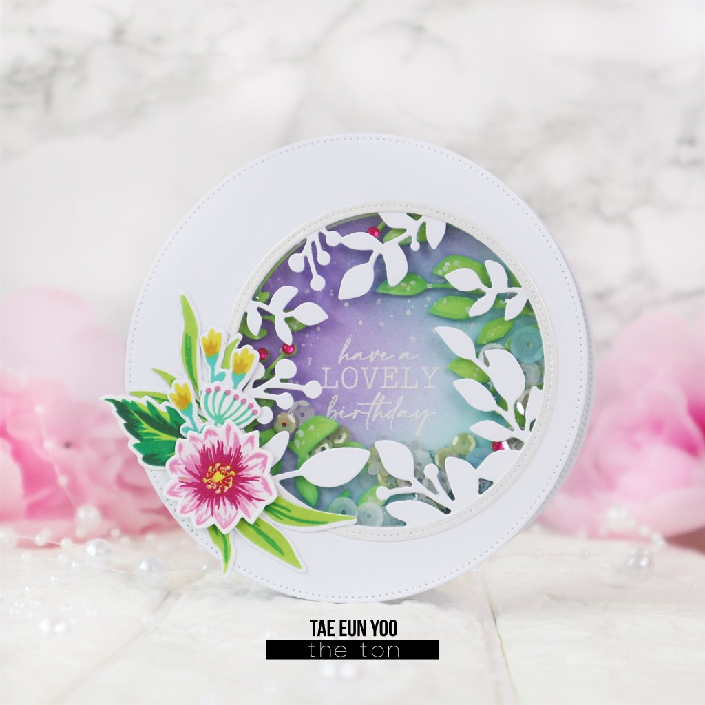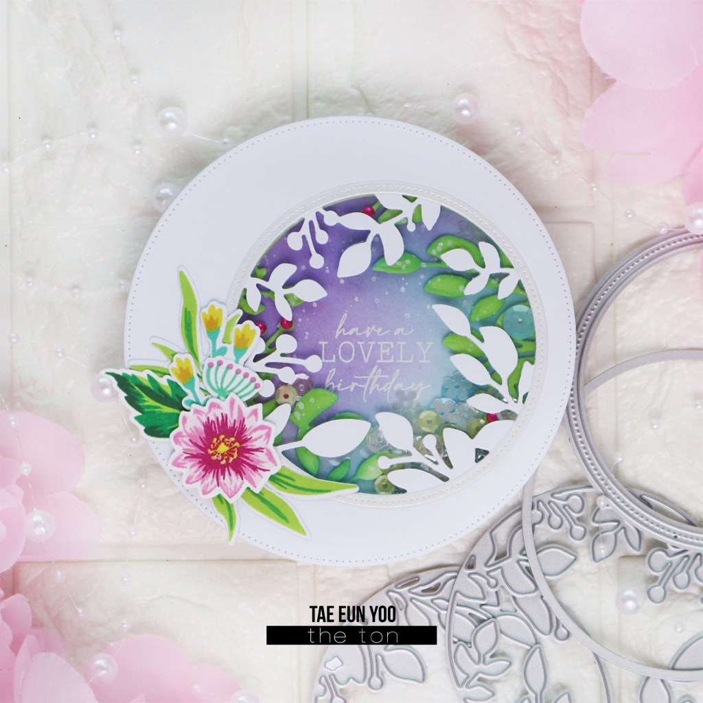 Hello and Happy Friday, crafty friends! Hope you’re all doing well! It’s TaeEun here today sharing a shaker birthday card which is showcasing the Round Foliage Window Layering Dies from our 6th Anniversary Release. It’s a lovely die set including four dies; two dies cut beautiful circle windows with foliage coming from the border, one die is for a stitched circle frame and the last one is a circle die.