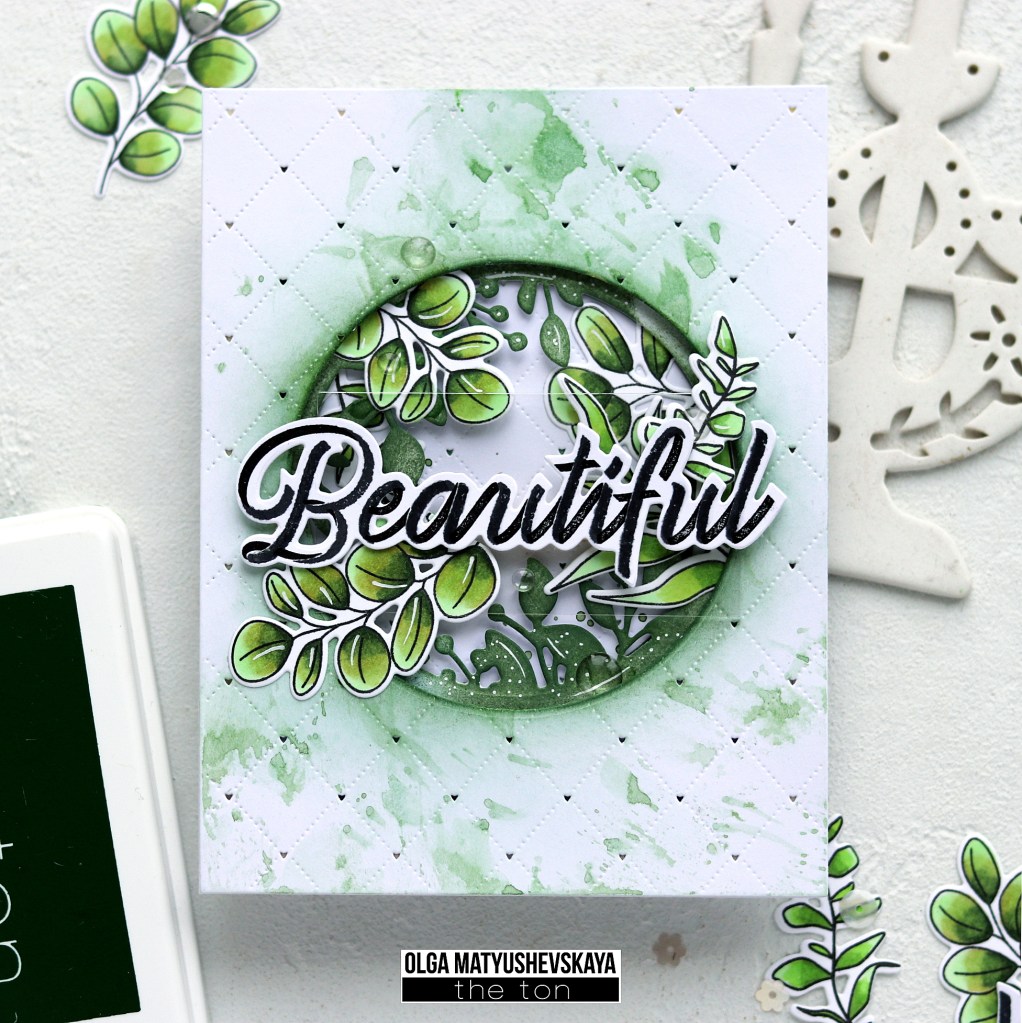 I cut next layer from this dies set and toned it with Everglade Moss Dye. I added the foliage from Fancy Foliage and Eucalyptus. I stamped it with Caviar and colored with markers. I used Fancy Foliage Coordinating Die and Eucalyptus Coordinating Die to cut foliage.