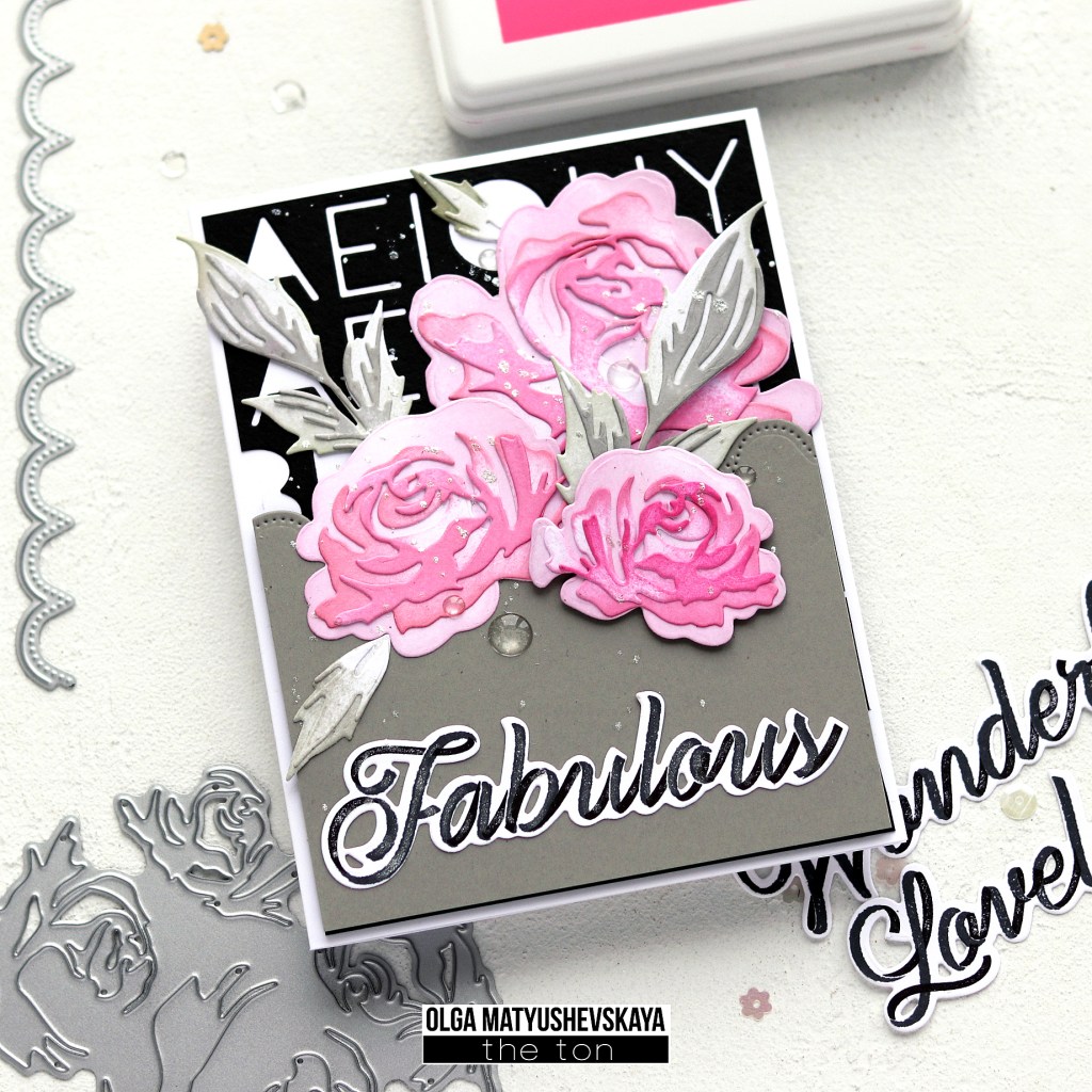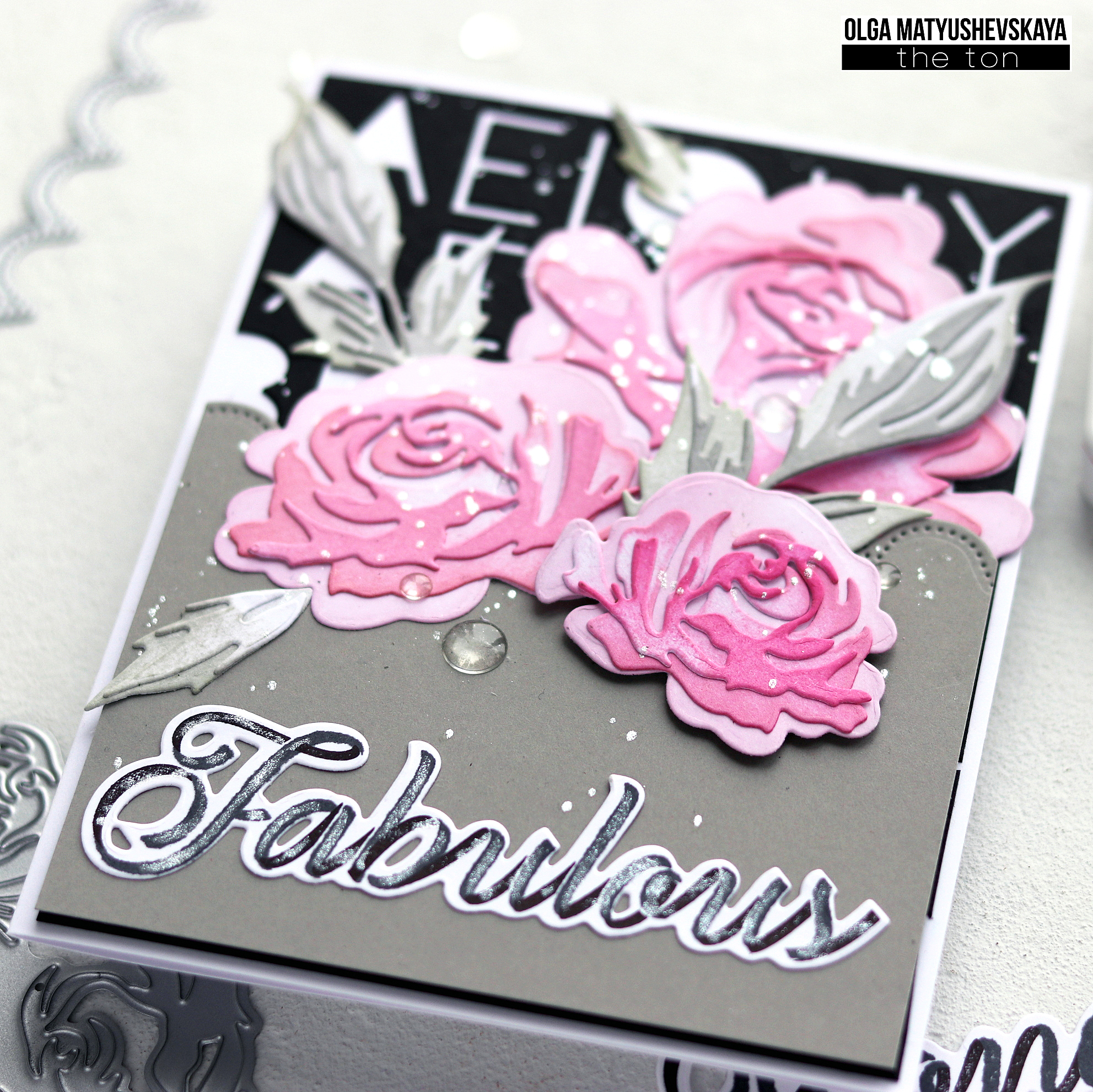 Next card. I used Radiant Roses Layering Dies. I cut all layers and toned it with Rose Quartz, Hollywood Star, Soft Garnet and Cosmopolitan Pink. I used Smoky Quartz and Crystal Pewter from the brunches.