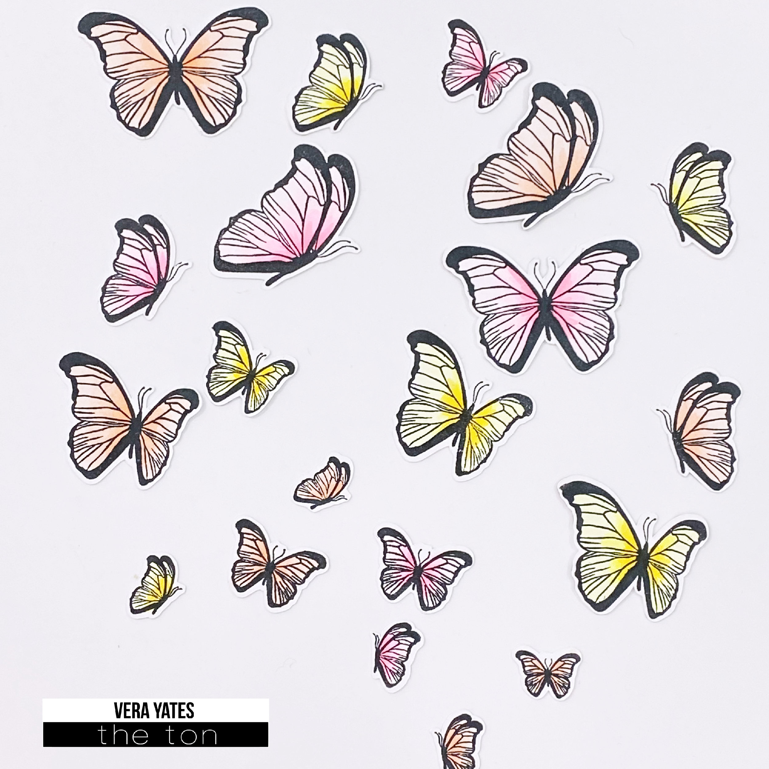 Yep, I figure it’s about time I try something different and I didn’t go half way, I go with black background. Am pretty excited with the way my card turned out. To start, I stamped and die cut a bunch of butterflies from Beautiful Butterflies 3 set. Colored them with Copic markers.