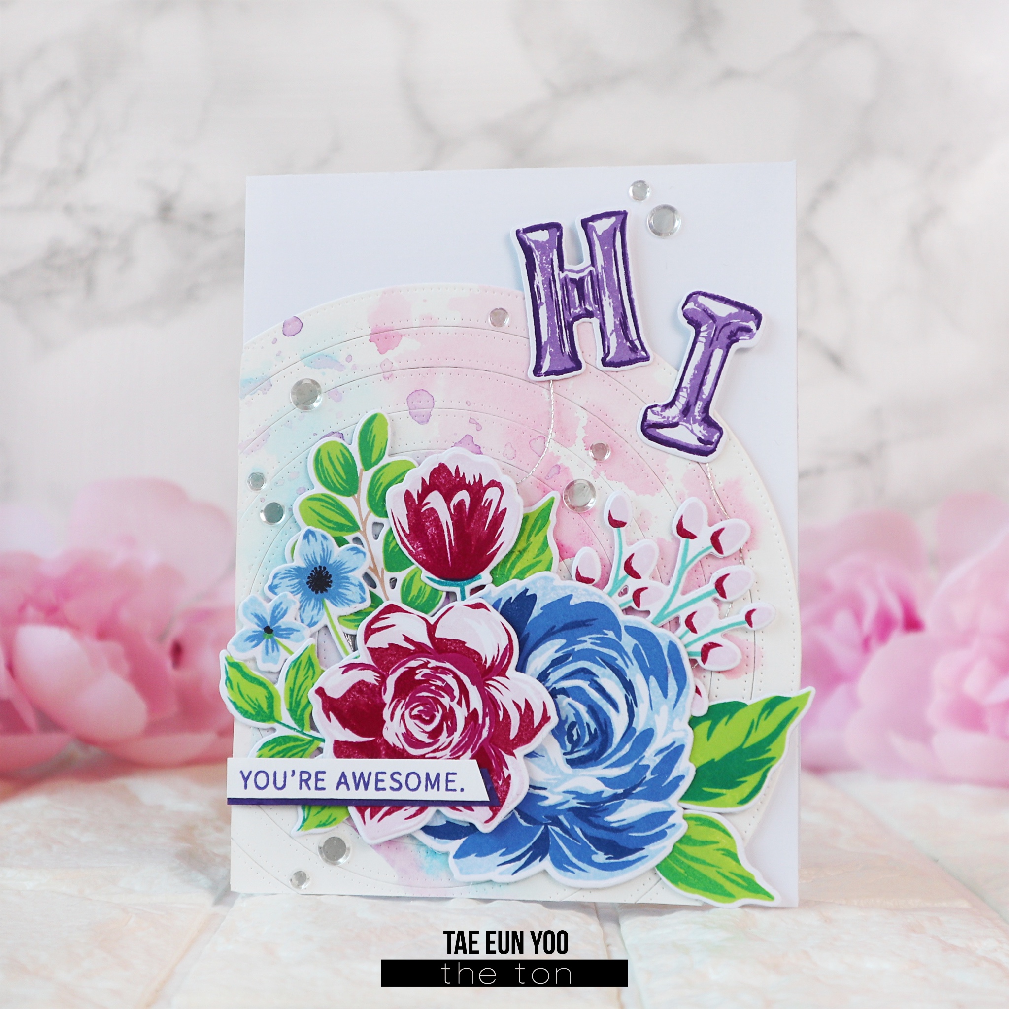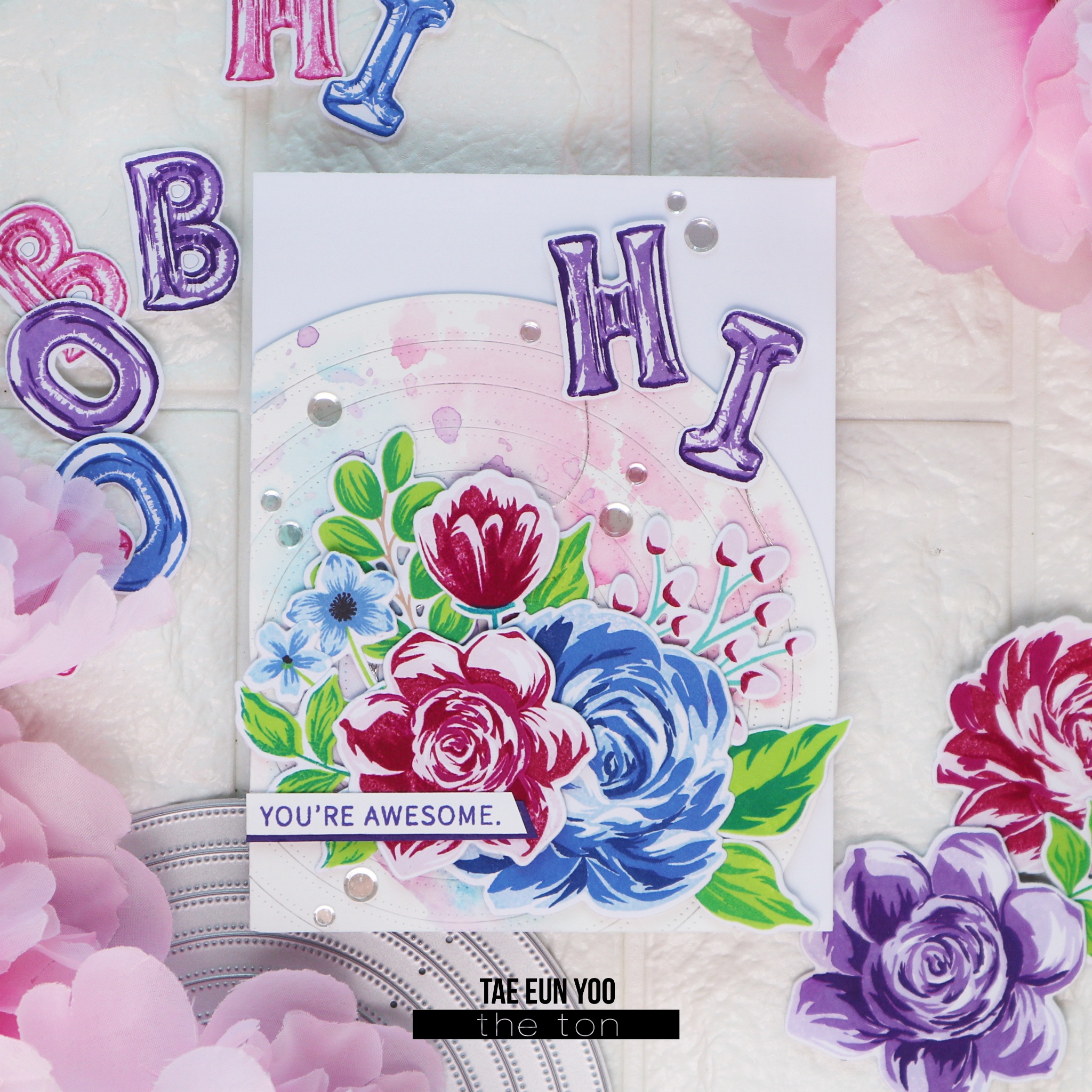 Hello everyone! It’s TaeEun here today with a bright floral card saying an cheering words 🙂 ! I arranged a bright bouquet using some of our grouped layering floral stamps and added the fun Balloon Alphas.