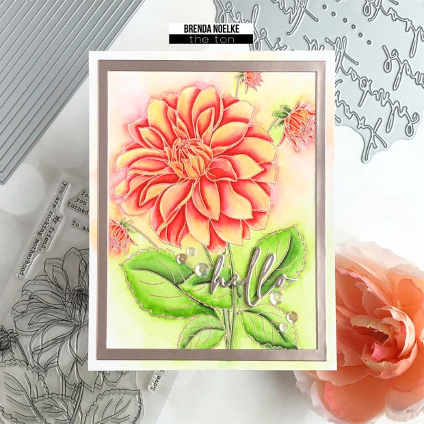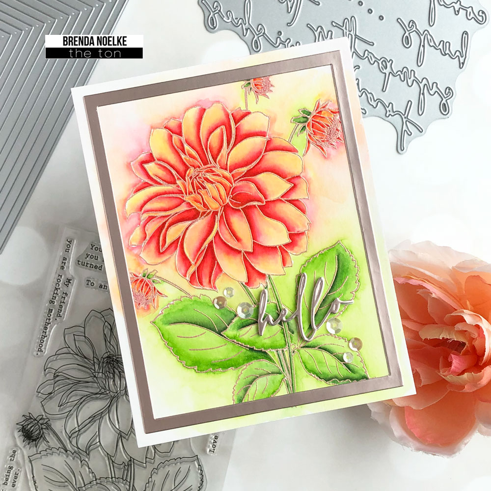 I began by heat embossing the beautiful dahlias in the Coming Up Dahlias Stamp Set onto bristol smooth cardstock with rose gold embossing powder. I watercolored the panel with Karin Brushpro Markers.