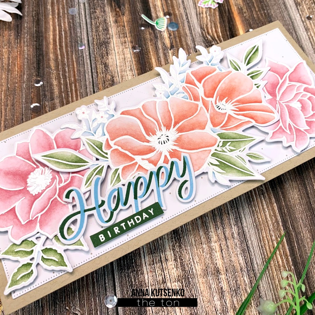 To start, I stamped images from Poppy Smiles and Wild Blooms on a piece of white cardstock and heat embossed them in white. I colored beautiful flowers with Holbein watercolors. After all images were dry, I cut out them with Poppy Smiles Coordinating Die and Wild Blooms Coordinating Dies.