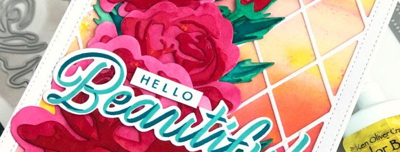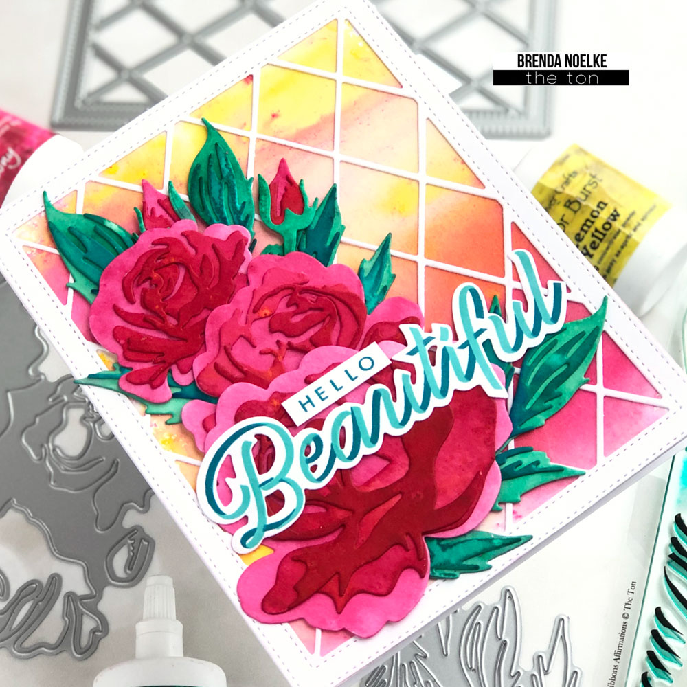 For the sentiment, I stamped the Ribbon Affirmations Stamp Set onto white cardstock with Caribbean Turquoise and Hot Tourmaline Inks, then cut them out with the Coordinating Dies. “Hello” is also from the Ribbon Affirmations set. It was stamped with Hot Tourmaline Ink and trimmed into a rectangle. I adhered the sentiment over the roses and background and called it done!!