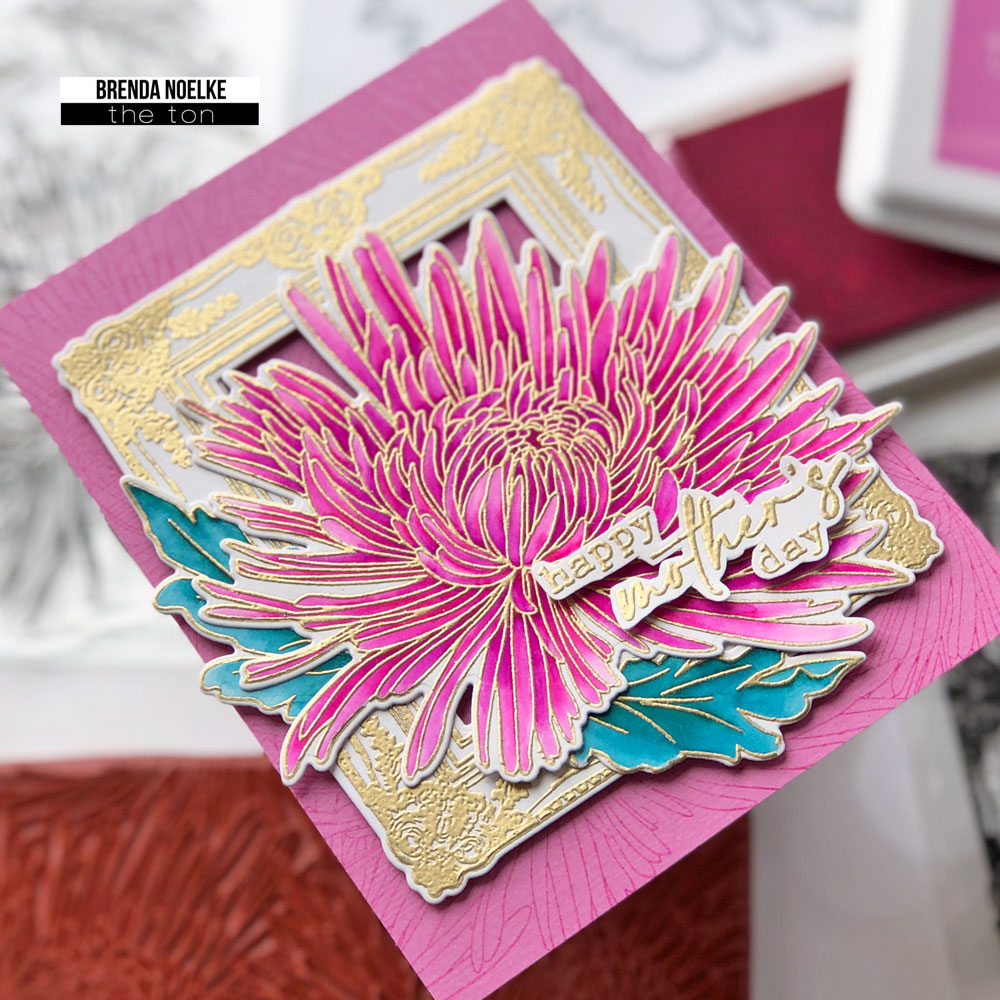 For my first card, I gold heat embossed the images from the Jumbo Spider Mum stamp set, Baroque Frame and a sentiment from Gladiola Cheer onto bristol smooth cardstock. I colored the mum and leaves with Zig Clean Color Markers. Once dry, I die-cut the images with the Jumbo Spider Mum and Baroque Frame Coordinating Dies.