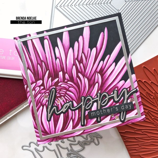 I stamped the Mum Close Up stamp onto white cardstock with Ballet Slippers Ink, then colored it with Copic markers. I die-cut the panel with the largest die in the Double Stitched Square Nested Dies. I die-cut the Square Frames Slim Borders Coverplate from some frosted silver cardstock and adhered the second largest one to my mum panel.