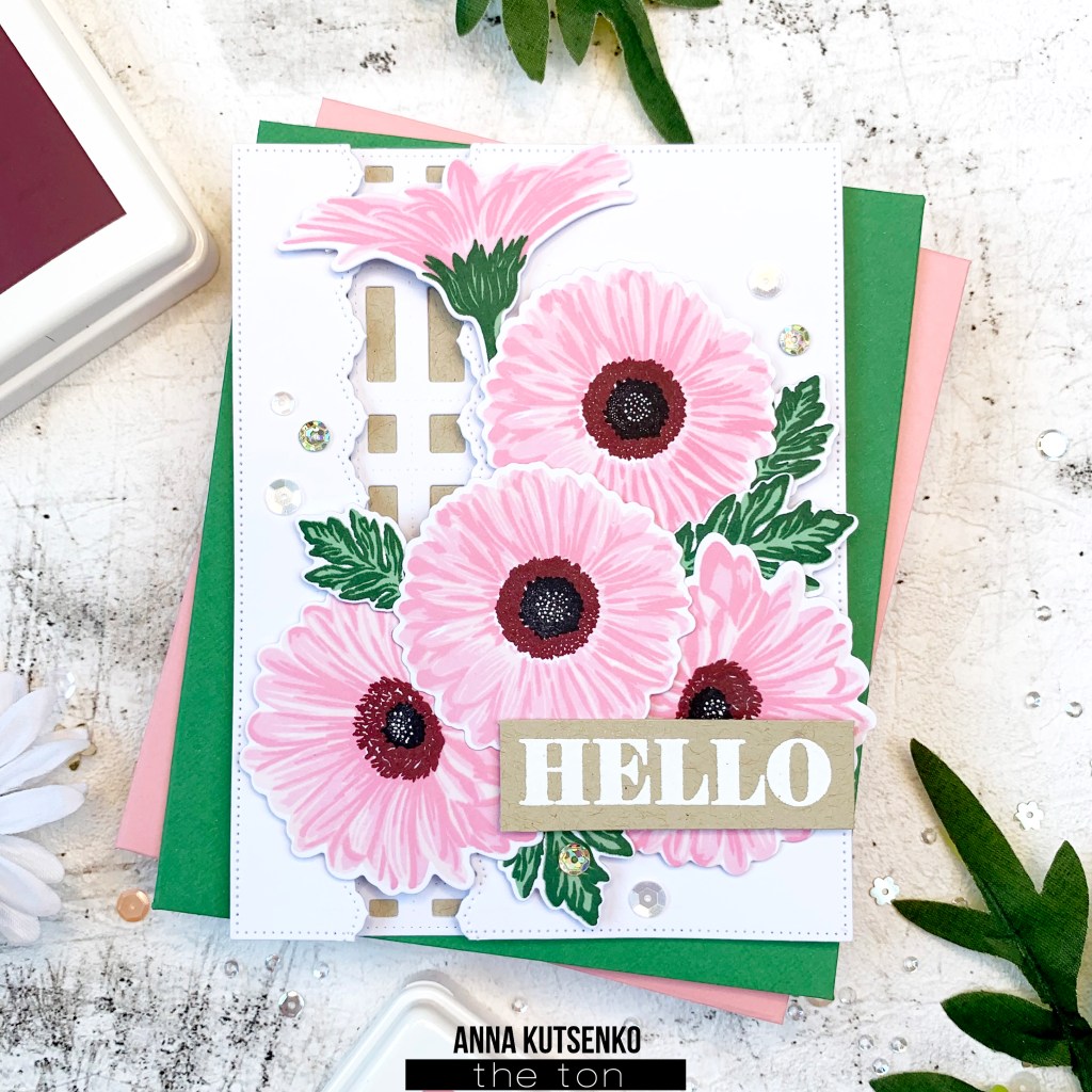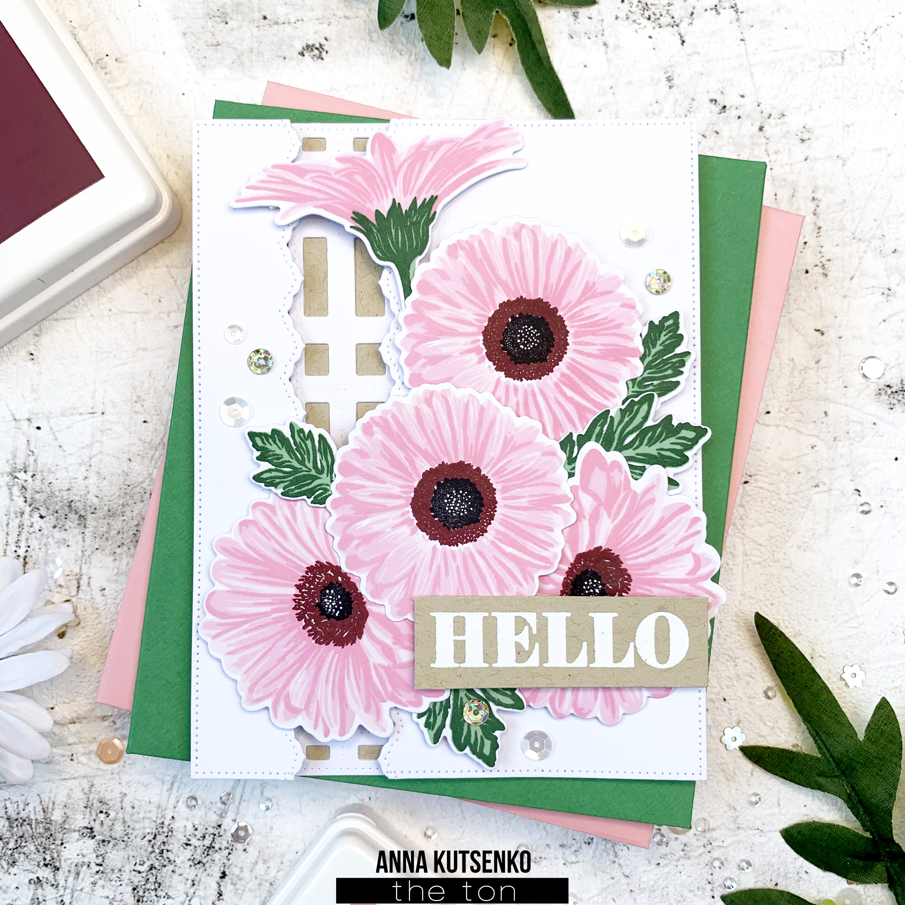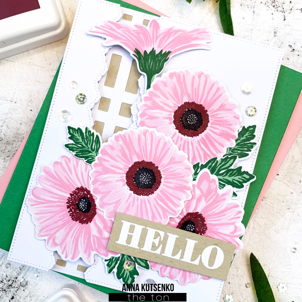 I stamped the flowers with Whisper Pink, Roze Quartz, Bubblegum, Wine and Noir. The leaves were stamped in Vineyard and Everglade Moss. All images were cut out using Grouped Fresh Daisies Coordinating Dies.