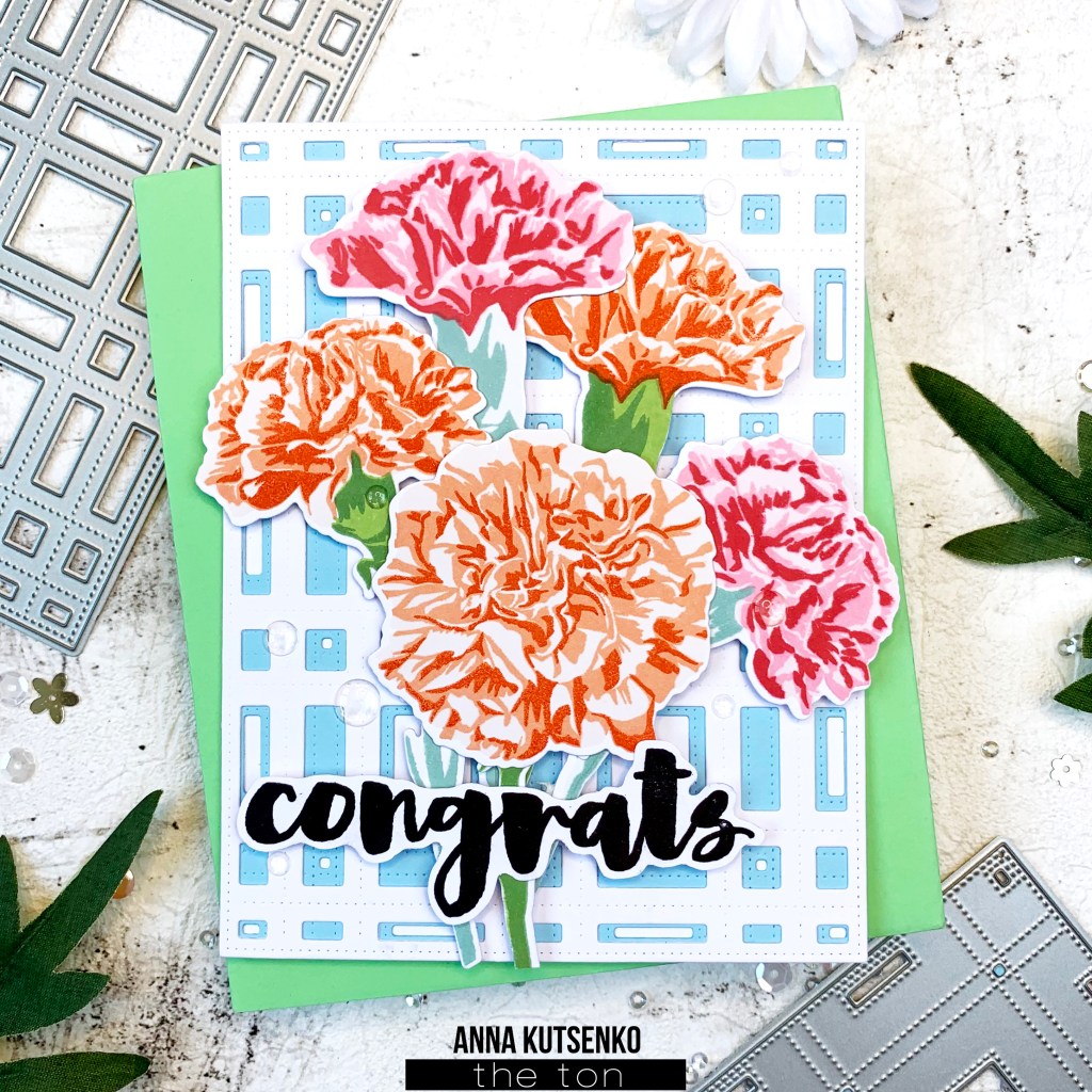Next, I adhered the bouquet of carnations on the card. I stamped the “Congrats” in Noir and fussy cut it. I added a few Dew Drops to embellish my card.