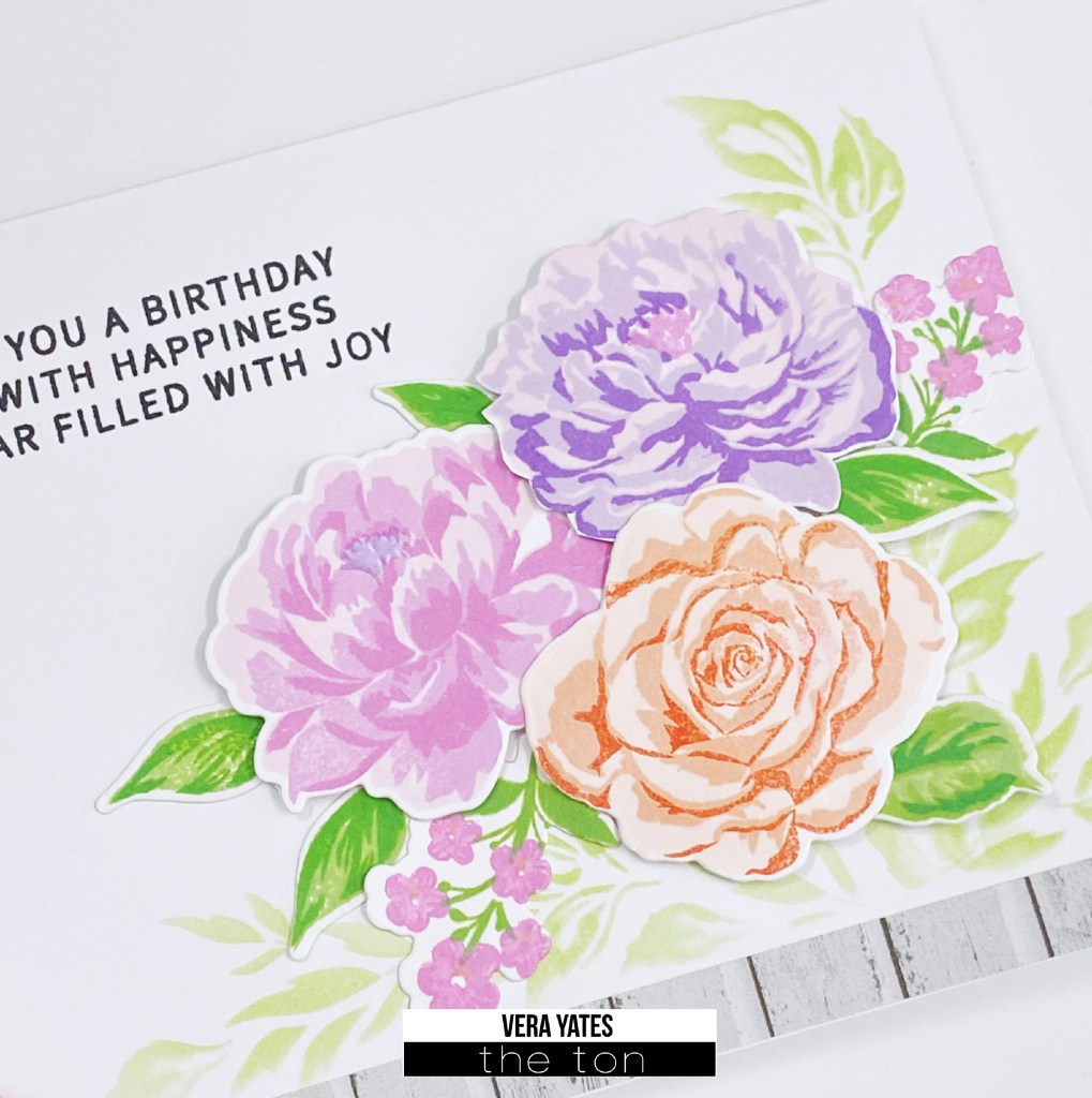 While waiting for all the new plants to settle and grow, I can continue dreaming of flowers through my card. Just like today’s card, which I made using The Ton Vivid Peonies and Grouped Fresh Garden Roses.