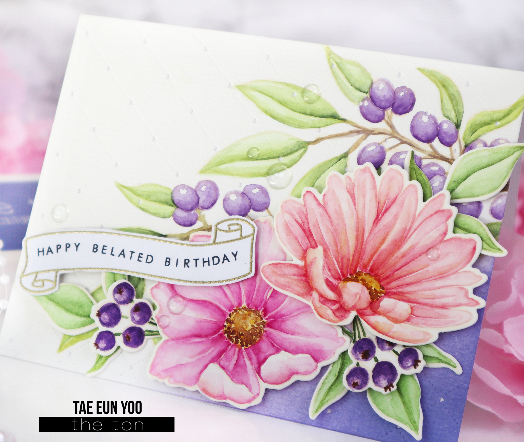 Hello and happy Friday everyone! Hope you’re doing well! It’s TaeEun here today with a watercolored floral birthday card! I used the berry branches from the Dove Friends set for my background and arranged the flowers from the Delightful Wildflowers set on it.