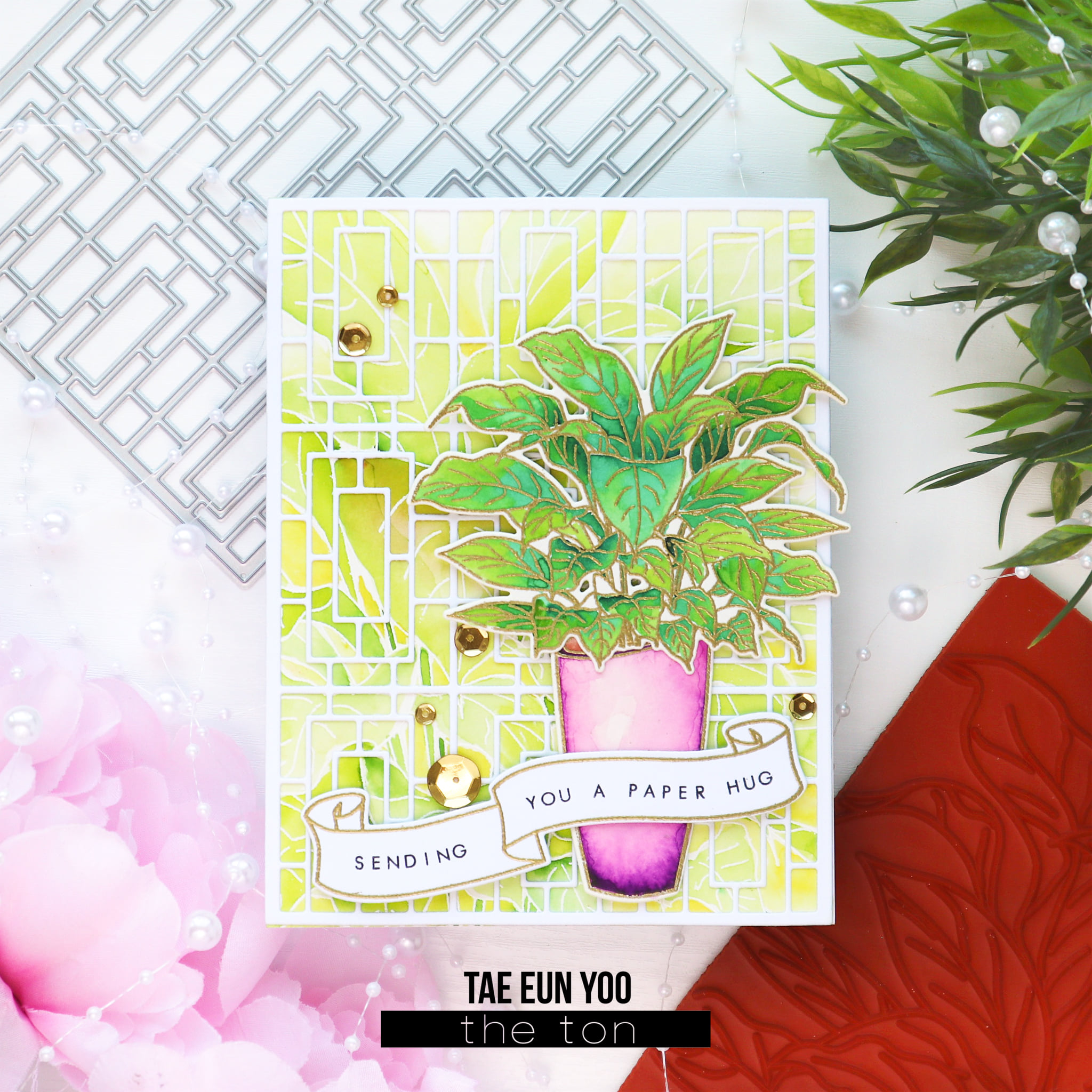 Created by Tae Eun using our Lush Plants, Plentiful Planters, Refreshing Evergreen Cling Stamp, Convention Coverplate Die, Many Banners stamp and Medallion Gold Sequins.