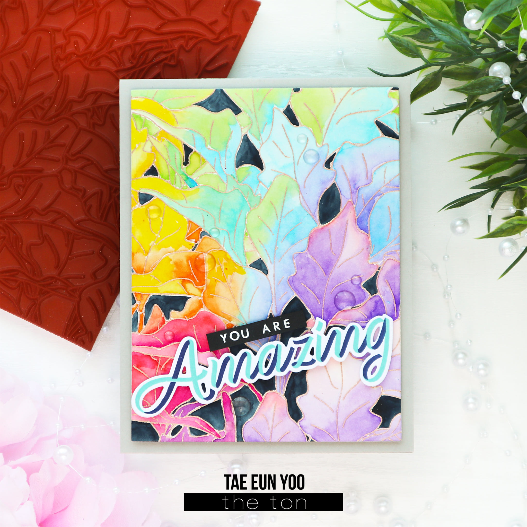 Created by Tae Eun with our Fig Leaves, Ribbons Affirmations. Ink: Bright Emerald, True Navy. Dew Drop Clear Enamel Dots