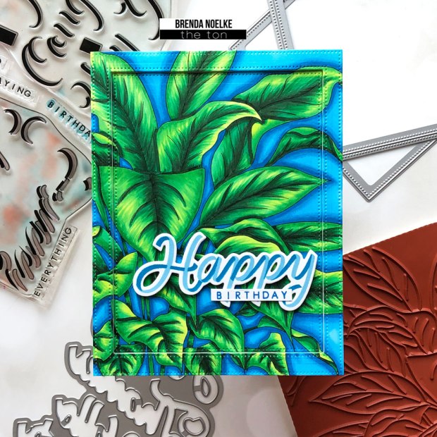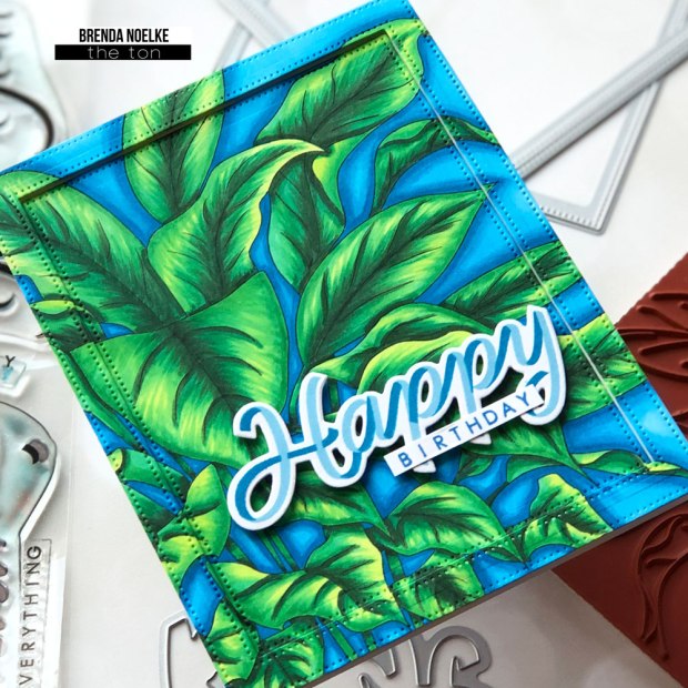 I knew as soon as I saw this stamp that I wanted to color it with Copics, so began this one by stamping the Refreshing Evergreen Background Cling Stamp onto white cardstock with Caviar Ink, then colored it with Copic markers. After spending so much time coloring it, I didn’t want to trim any of it away, so I die-cut it with the two largest dies in the Double Pierced Rectangle A2 Nested Dies. I popped the outside frame up with foam adhesive onto an A2 size card base and adhered the inner panel flat to the card base.