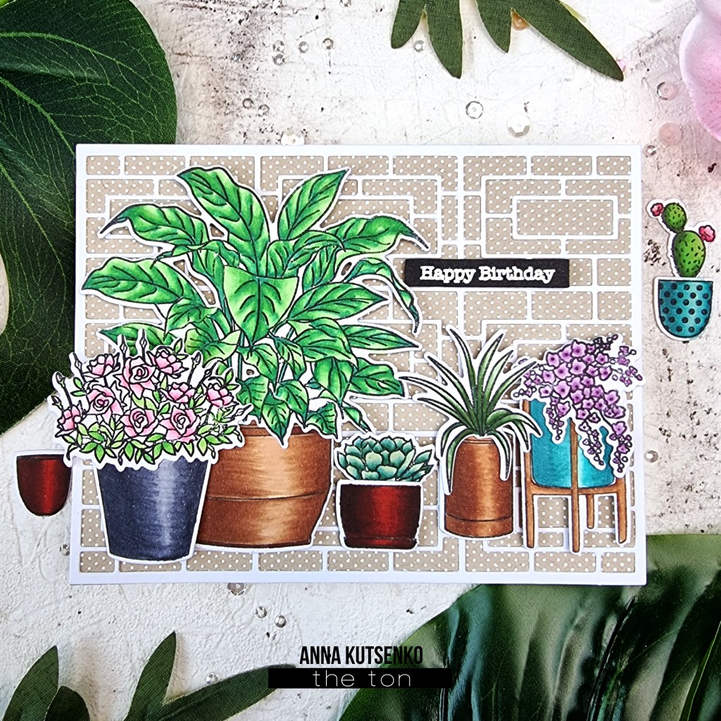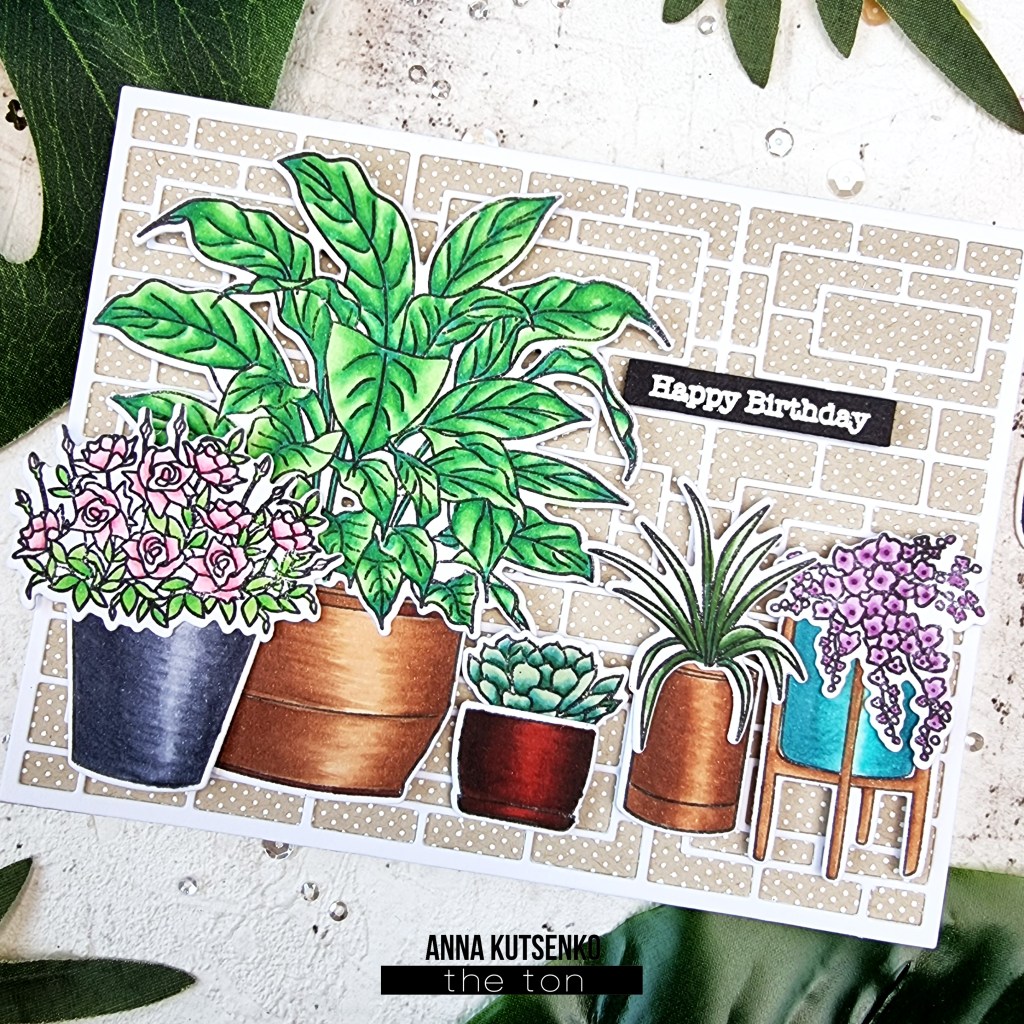 I started by stamping plant images from Lush Plants, Plentiful Planters and Petite Planters with Caviar on a piece of white cardstock. All of them were colored with Copic markers. I then cut out them using matching dies: Lush Plants Coordinating dies, Plentiful Planters Coordinating dies and Petite Planters Coordinating dies.