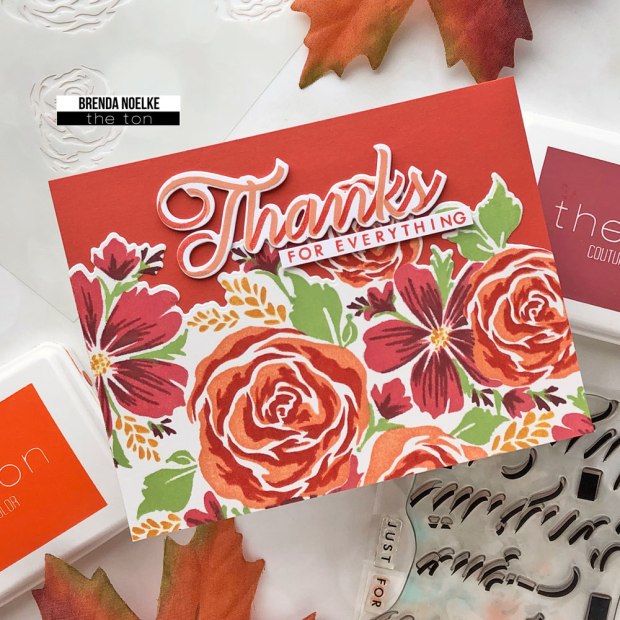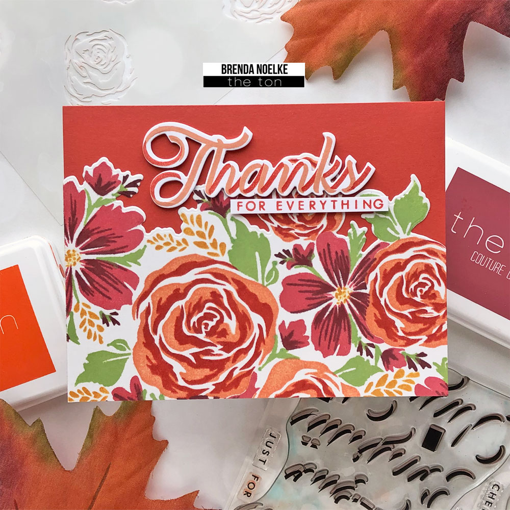 The sentiment is from the Fall Bouquet Stamp Set. It was stamped onto white cardstock with Noir and Corraline inks, then die-cut with the Coordinating Die and cut into a narrow strip. I also die-cut the thankful die two more times from white cardstock and adhered them behind the stamped one for dimension. The sentiment was adhered with a combination of liquid glue and foam tape. Finally, I added a few Dew Drop Clear Enamel Dots for a little shine.