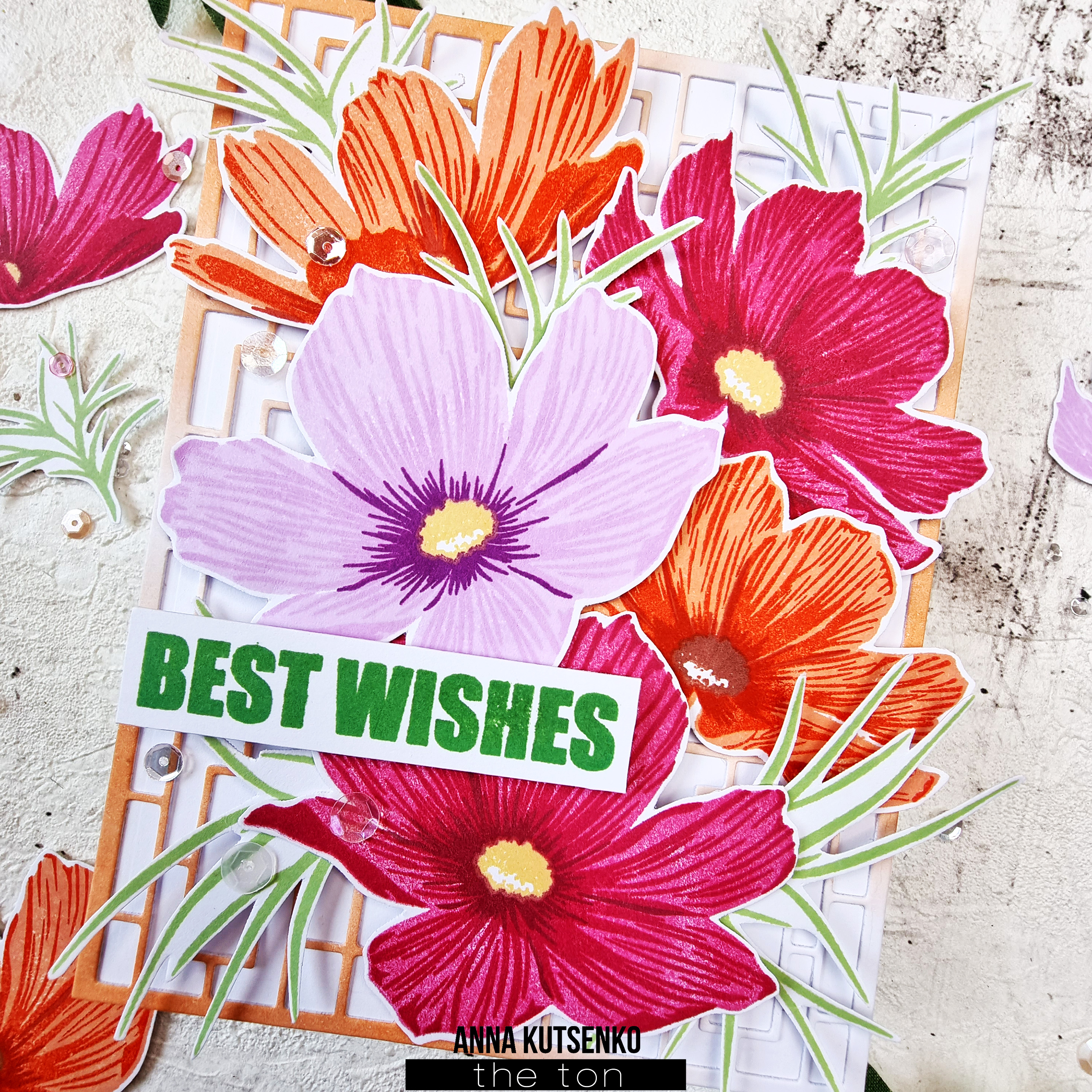 I started by stamping beautiful flowers from Charming Cosmos on a white cardstock. For the pink (light purple) flower, I used Soft Orchid, Orchid Crush and Plum Wine ink pads. I stamped orange cosmos in Peach Blossom, Coralline and Coral Cavern. The red flowers were stamped with Red Sangria, Lipstick Red and Wine inks. For the foliage, I used Matcha dye ink. I fussy cut all images, but you can use Charming Cosmos Coordinating Die for quick and easy way.