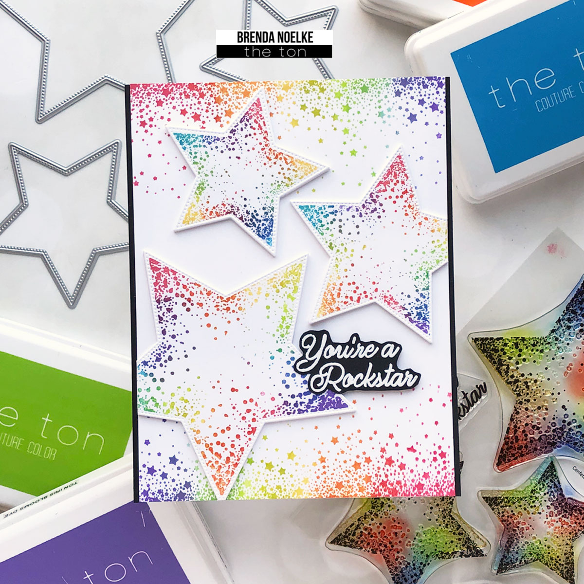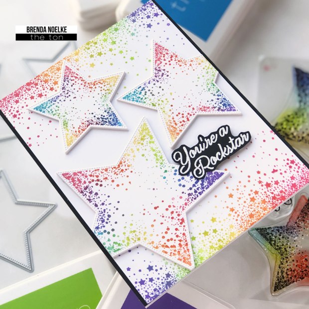 I die-cut the stars using the Confetti Shapes Star Coordinating Dies and cut three extra of each size to adhere behind the stamped stars for dimension. I trimmed a bit from each side of the white panel, then adhered strips of black cardstock to each side of a white A2 card base and adhered the panel to that. The sentiment, also from the Confetti Shapes Star Set, was white heat embossed onto black cardstock and fussy cut. It was adhered with a combination of liquid and foam adhesive.