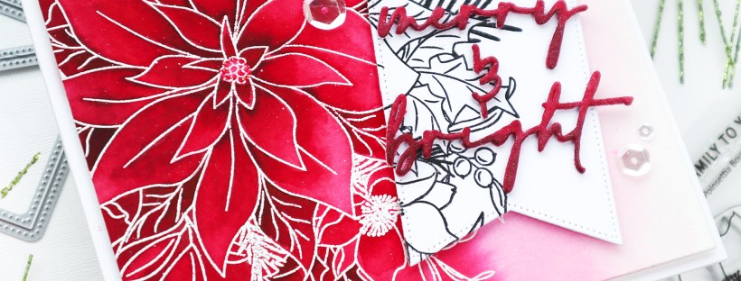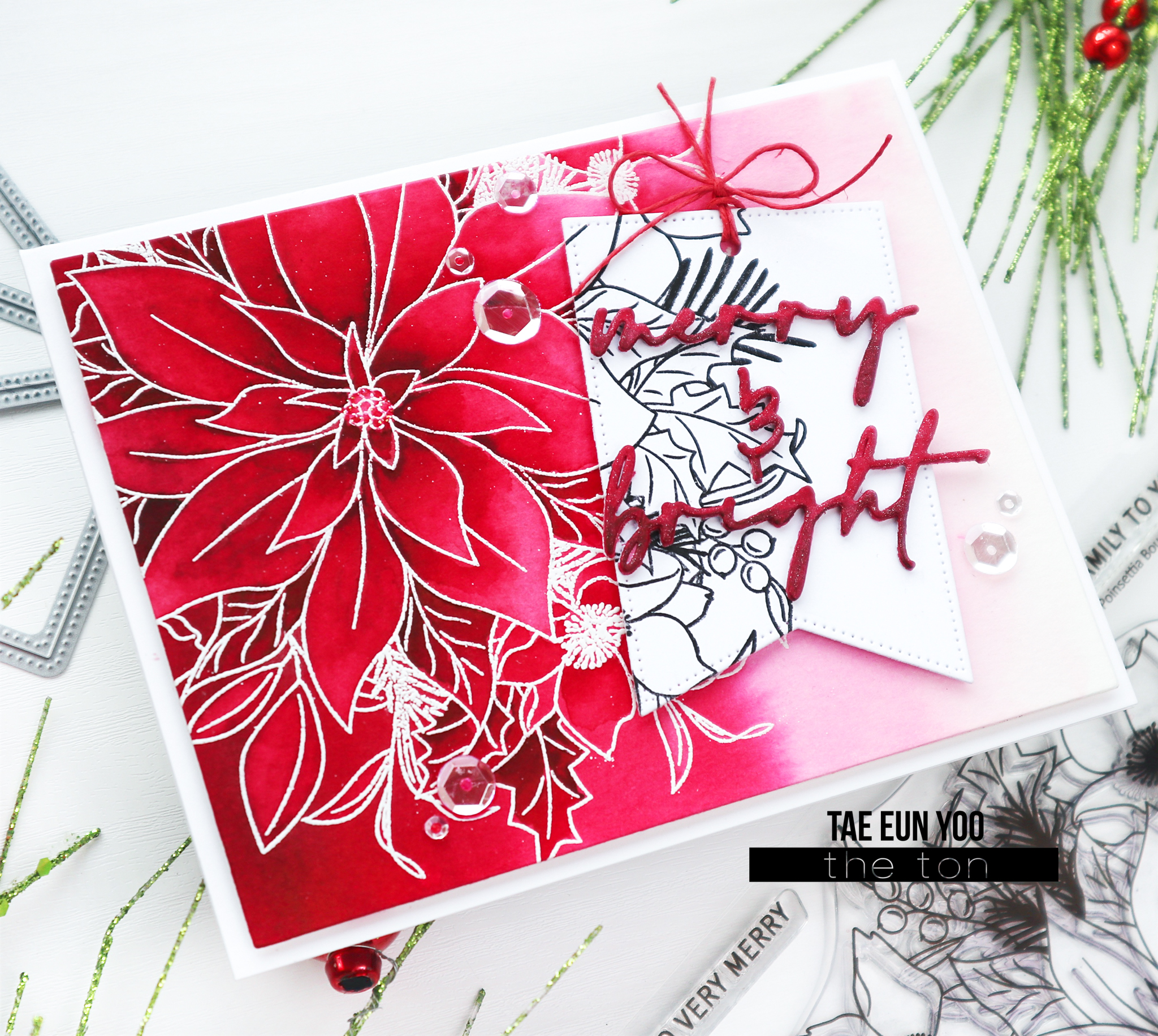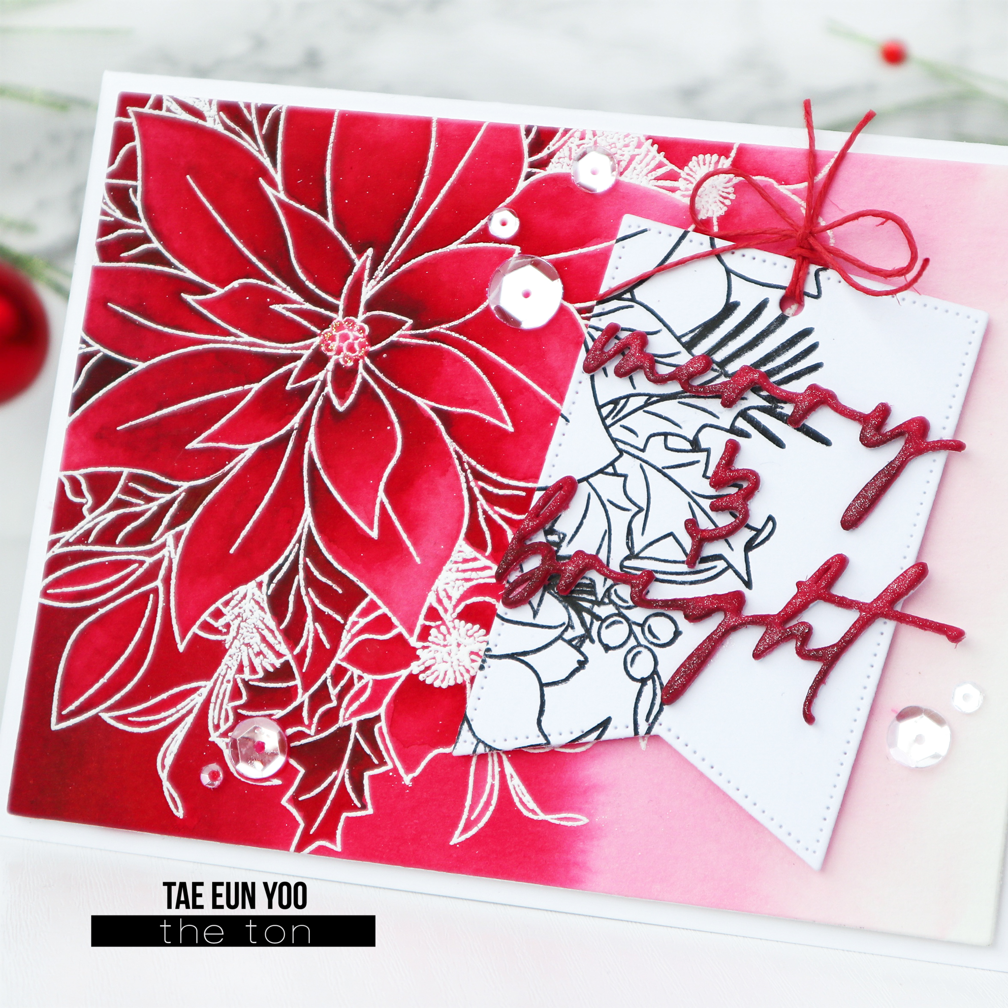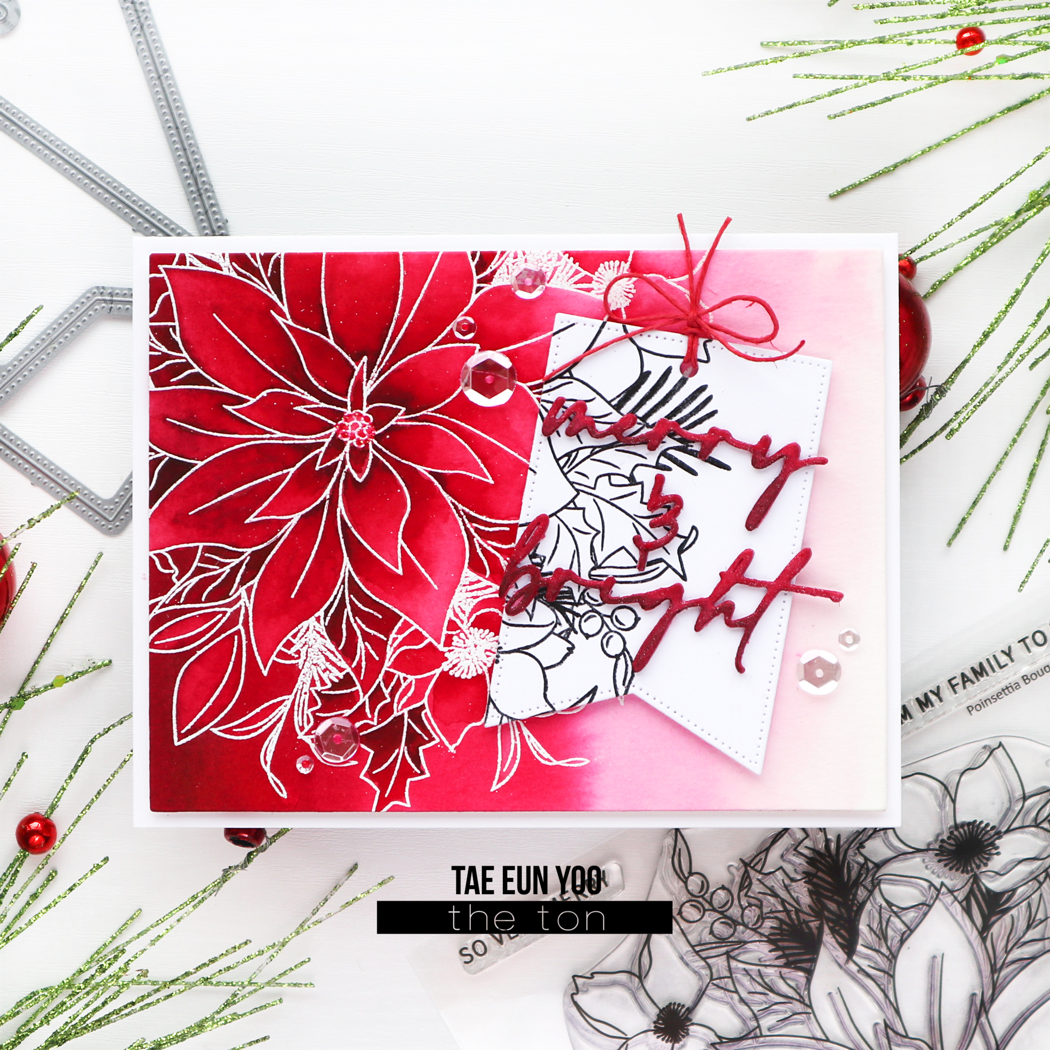 Hello and Happy Monday, friends! It’s TaeEun here today with a holiday card in red! Actually red isn’t my favorite color but I tend to make holiday cards in red and I always loved the results 🙂 ! For today’s card I used the Poinsettia Bouquet stamp set with the gorgeous large poinsettia cluster image.