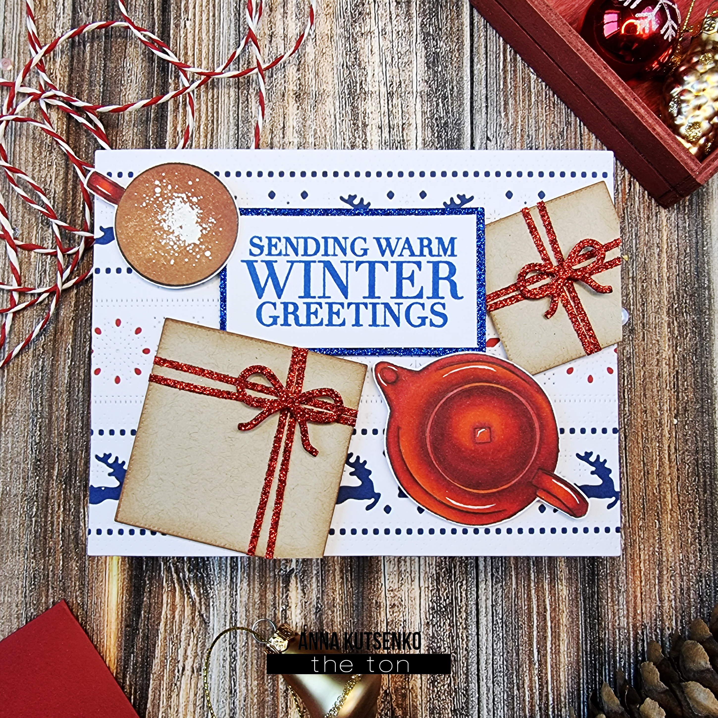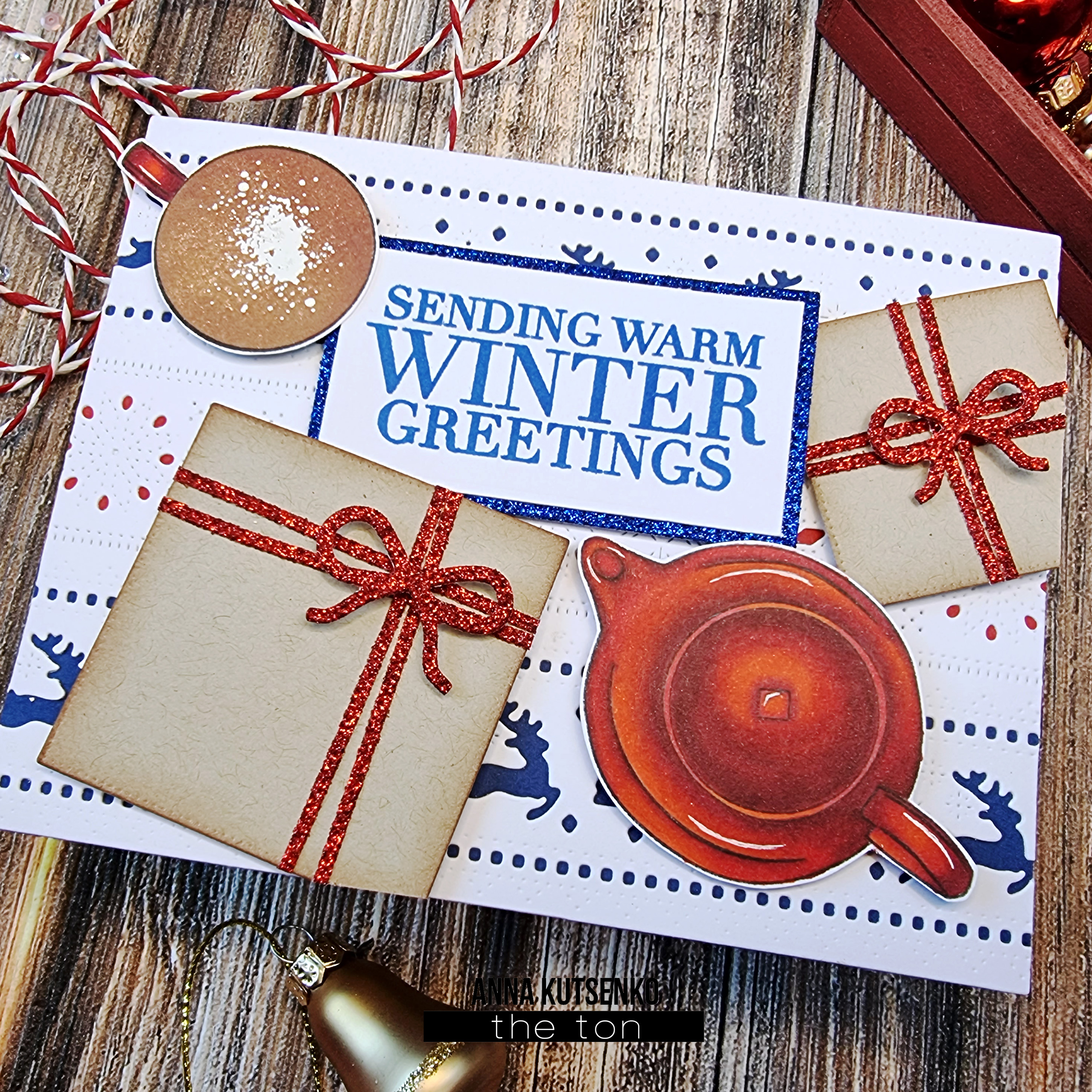 I started by stamping a cup of tea and teapot from Hug in a Mug, colored them with Copic markers and fussy cut them. Then, I added some white embossing enamel to the cup image. To make gift box images, I die cut squares from sand cardstock using Confetti Shapes Square Coordinating Dies. The bows were cut out from red glitter cardstock.