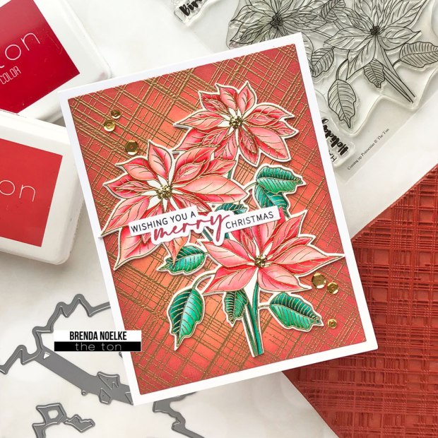 For the background, I gold heat embossed the Modern Plaid Cling Background Stamp onto a panel of peach cardstock. I used the second largest die in the Rectangle A2 Nested Die Set to die-cut the panel. I blended Peach Blossom, Coral Cavern and Valentine Red Inks onto the panel with blending brushes, blending the darkest color around the edge and fading it toward the middle. The poinsettia die-cut were adhered to the panel. The sentiment is from the Easy Expressions Holiday Stamp Set. I stamped it with Valentine Red and Noir Inks, then die-cut it with the Coordinating Die and adhered it across the poinsettias. A few Medallion Gold Sequins and some gold Stickles on the centers of the poinsettias add a little shine.