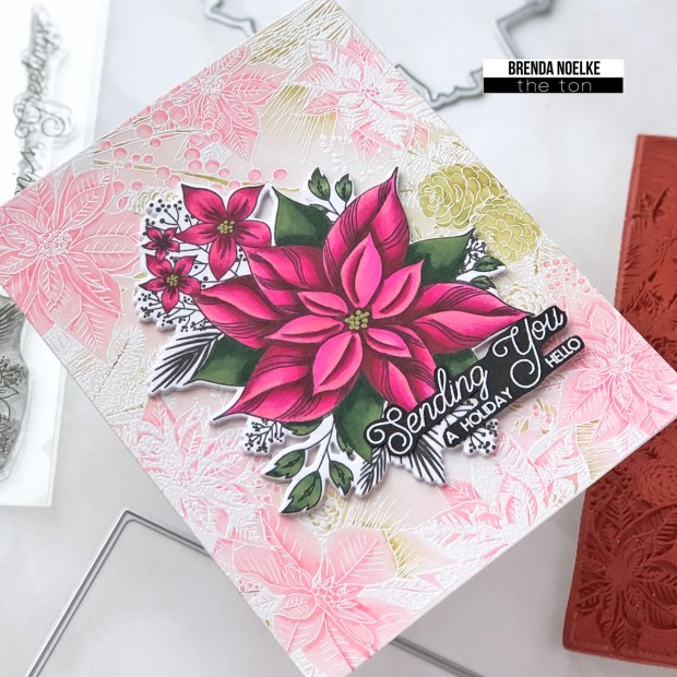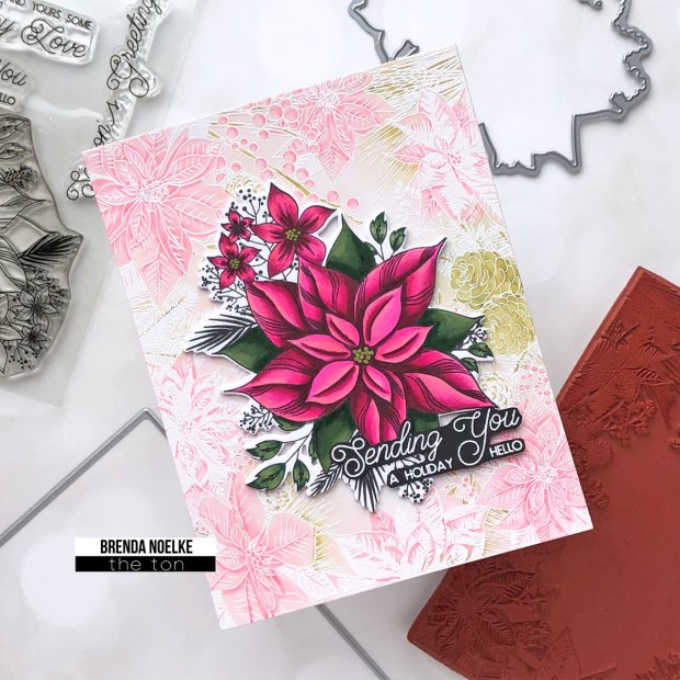 I started by stamping the Holiday Love Poinsettia Stamp Set onto white cardstock with Caviar Ink. I colored it with Copic markers and cut it out with the Coordinating Die. I also die-cut three more layers from heavyweight white cardstock to layer behind the colored one for dimension.For the background, I white heat embossed the Holiday Border Cling Background Stamp onto Bristol cardstock and did some loose watercoloring with Zig Clean Color Markers. Once it was dry, I die-cut it with the largest die in the Rectangle A2 Nested Die Set and adhered the die-cut poinsettia in the center. The sentiment, also from the Holiday Love Poinsettia Stamp Set, was white heat embossed onto black cardstock and fussy cut out. It was adhered with foam and liquid adhesive. I added dots with a gold metallic marker to the centers of the poinsettias.