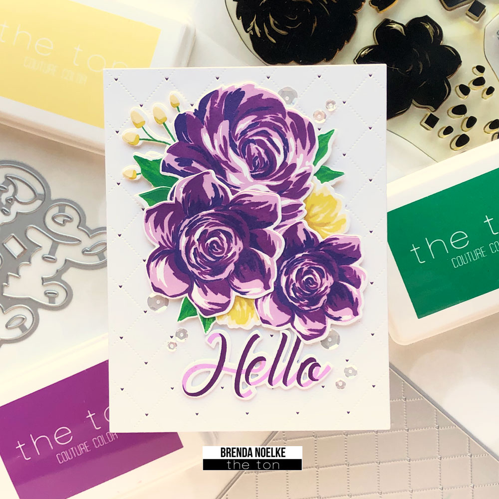 For the background, I die-cut the Quilted A2 Coverplate Die from white cardstock and layered it over a panel of plum cardstock, then adhered it to a white, top-folding card base. The roses, flowers and leaves were arranged, picked up with Press ‘N Seal, adhered together, then added to the front of the card with foam adhesive. The die-cut sentiment was adhered with liquid adhesive. A few Glass Slippers Sequins were sprinkled on for a little shine.