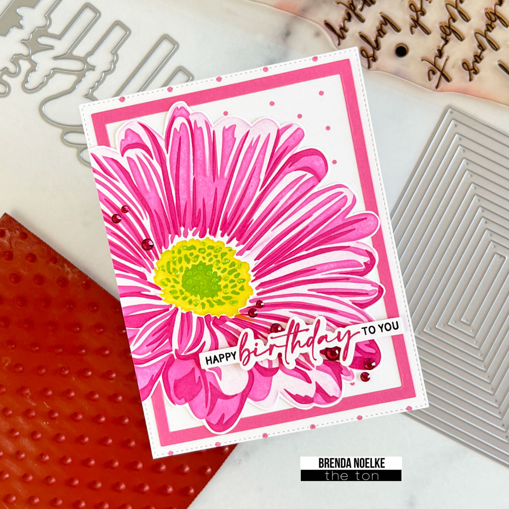 For the background, I stamped the Delicate Polka Dots Cling Stamp onto white cardstock with Hollywood Star ink. I die-cut the panel with the largest die in the Double Stitched Rectangle A2 Nested Die Set. The Rectangle A2 Frames Slim Borders Coverplate Die was cut from pink cardstock and the 2nd largest die was adhered to the background panel. The daisy was adhered and the excess was trimmed from the edge. The sentiment is from the Easy Expressions Birthday Stamp Set. It was stamped onto white cardstock with Cosmopolitan Pink and Noir inks, then cut out with the Coordinating Die. It was popped up with foam adhesive. A sprinkling of Deep Pink Rhinestones and some Nuvo Drops on the center of the flowers finished off the cards nicely and added a bit of shine.