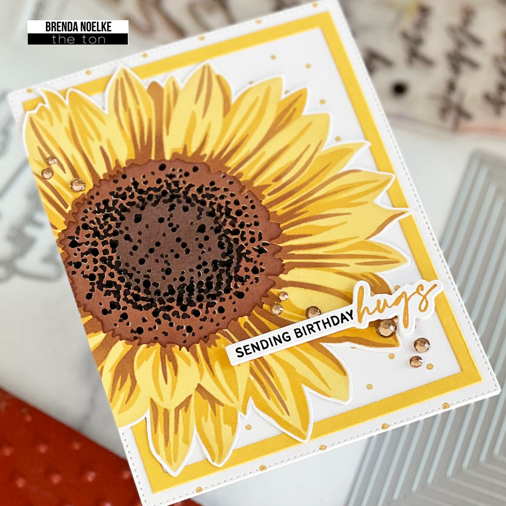 For this one I used Beach Blondie, Amber Citrine and Found Topaz for the petals. I used Aspen Cocoa, Dark Roast and Noir inks for the center. I also added some Black Nuvo Drops to the center of the sunflower for a little shine. As before, I fussy cut the sunflower, but there is a Coordinating Die available.