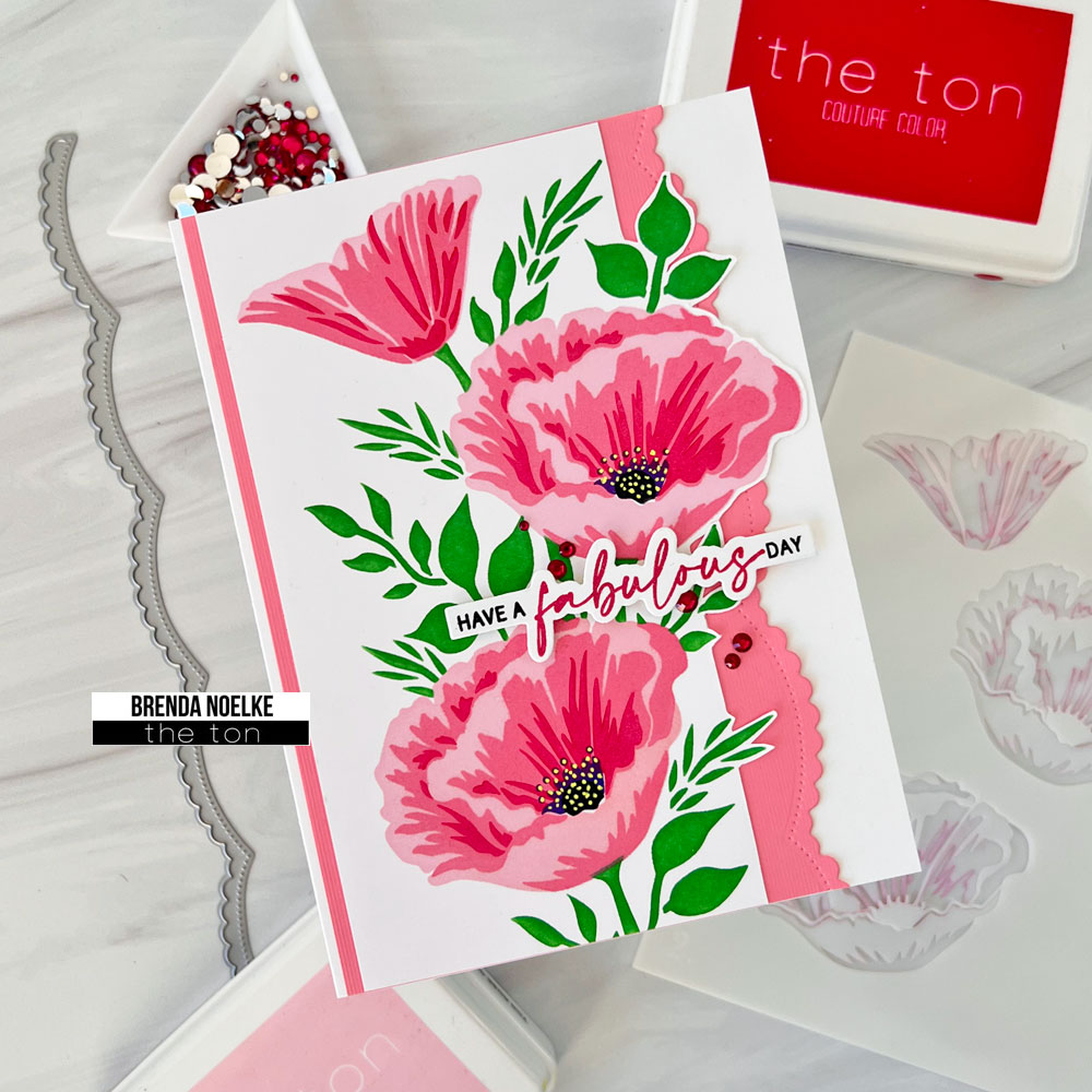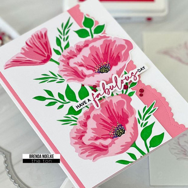 I began by inking the Precious Poppies Layering Stencils with Rose Quartz, Soft Garnet, Red Sangria, Bright Fern, Grape Crush and Noir Inks. I added some dots to the centers of the poppies with a yellow gel pen. I fussy cut along the right edge. You could do some partial die-cutting with the Coordinating Die, but I don’t have it, so I just cut it by hand.