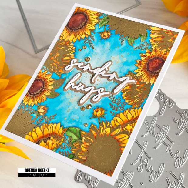 I began by gold heat embossing the Sunflower Border Cling Stamp onto Bristol smooth cardstock. I watercolored it with Karin Brushmarker Pro markers, then splattered it with clean water and diluted metallic gold paint. I die-cut the panel with the second largest die in the Rectangle A2 Nested Die Set and adhered it to a white top-folding card base.