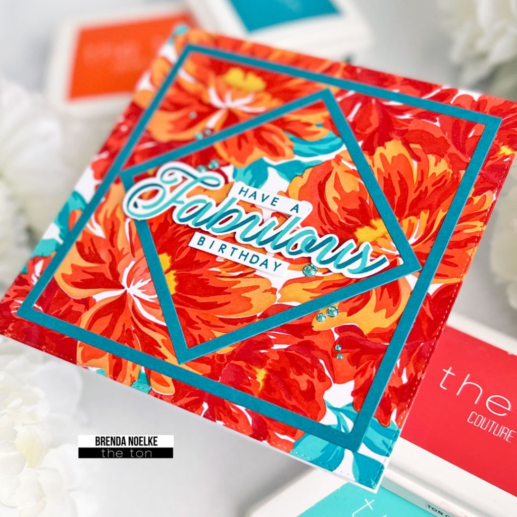 I inked up the blooms in the Gentle Peonies onto Bristol smooth cardstock with Peach Blossom, Coralline, Coral Cavern, Valentine Red, Lemon Drop and Found Topaz inks. For the leaves I used Bright Emerald and Hot Tourmaline. I die-cut the panel with largest die in the Double Stitched Square Nested Die Set.