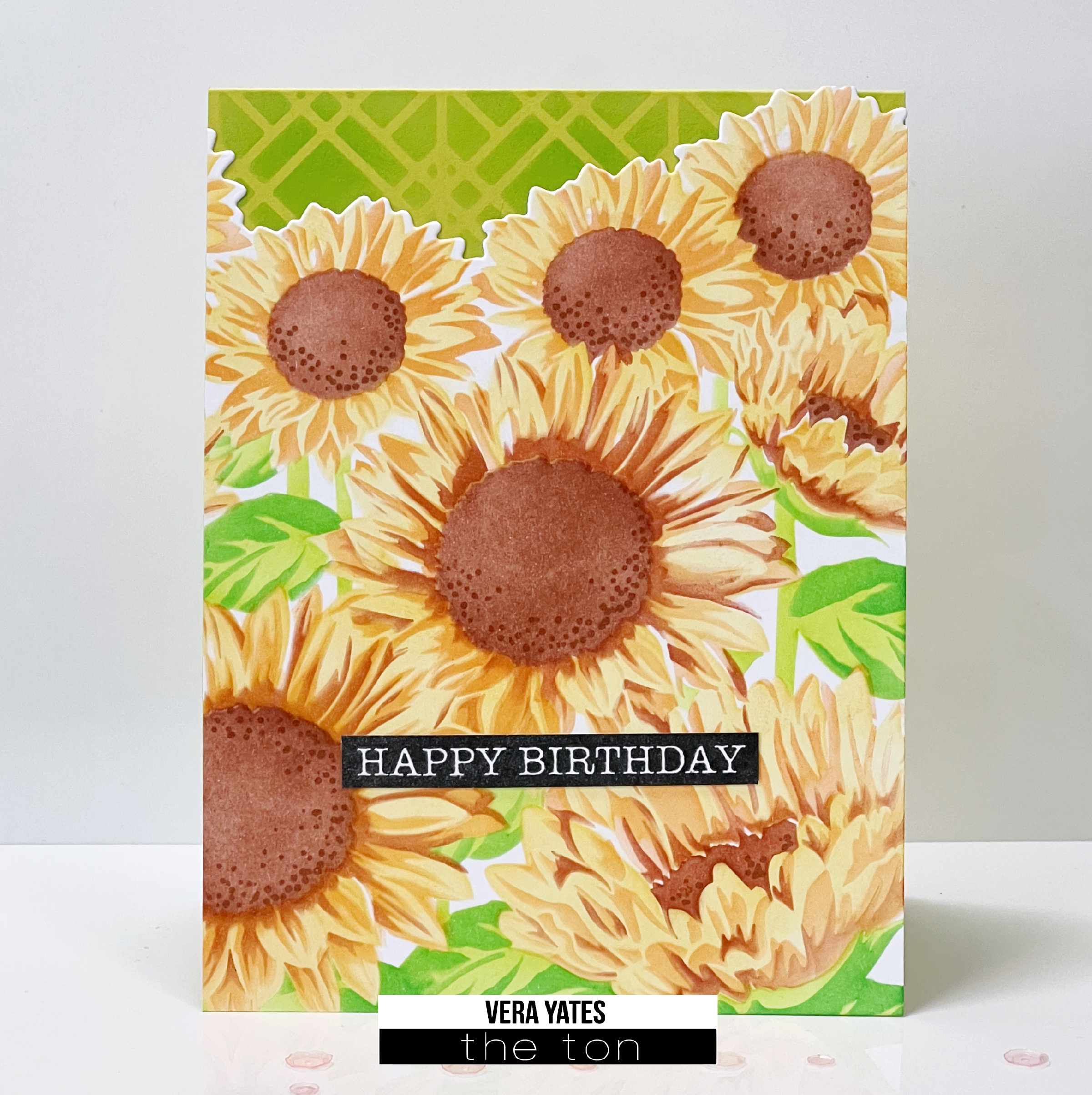The other sunflower panel went to the card below. Instead of white ink this time I inked up the card base with Honeydew.