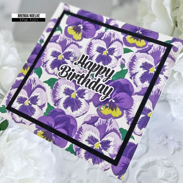 My second card is a 5.5″ square card featuring the Pretty Pansies Background Layering Stencil Set