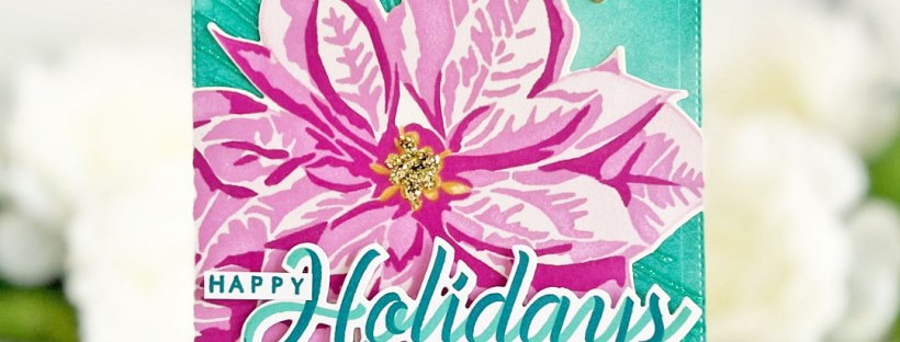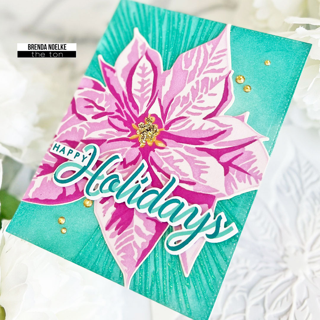 For the background, I blended Caribbean Turquoise and Hot Tourmaline inks onto a panel of Bristol smooth cardstock that was die-cut with the largest die in the Double Stitched Rectangle A2 Nested Die Set. Then I inked the Pine Stencil with Tourmaline Ink and added some sparkly Stickles freehandedly to the pine sprig. Once it was dry, I adhered the poinsettia to the panel.