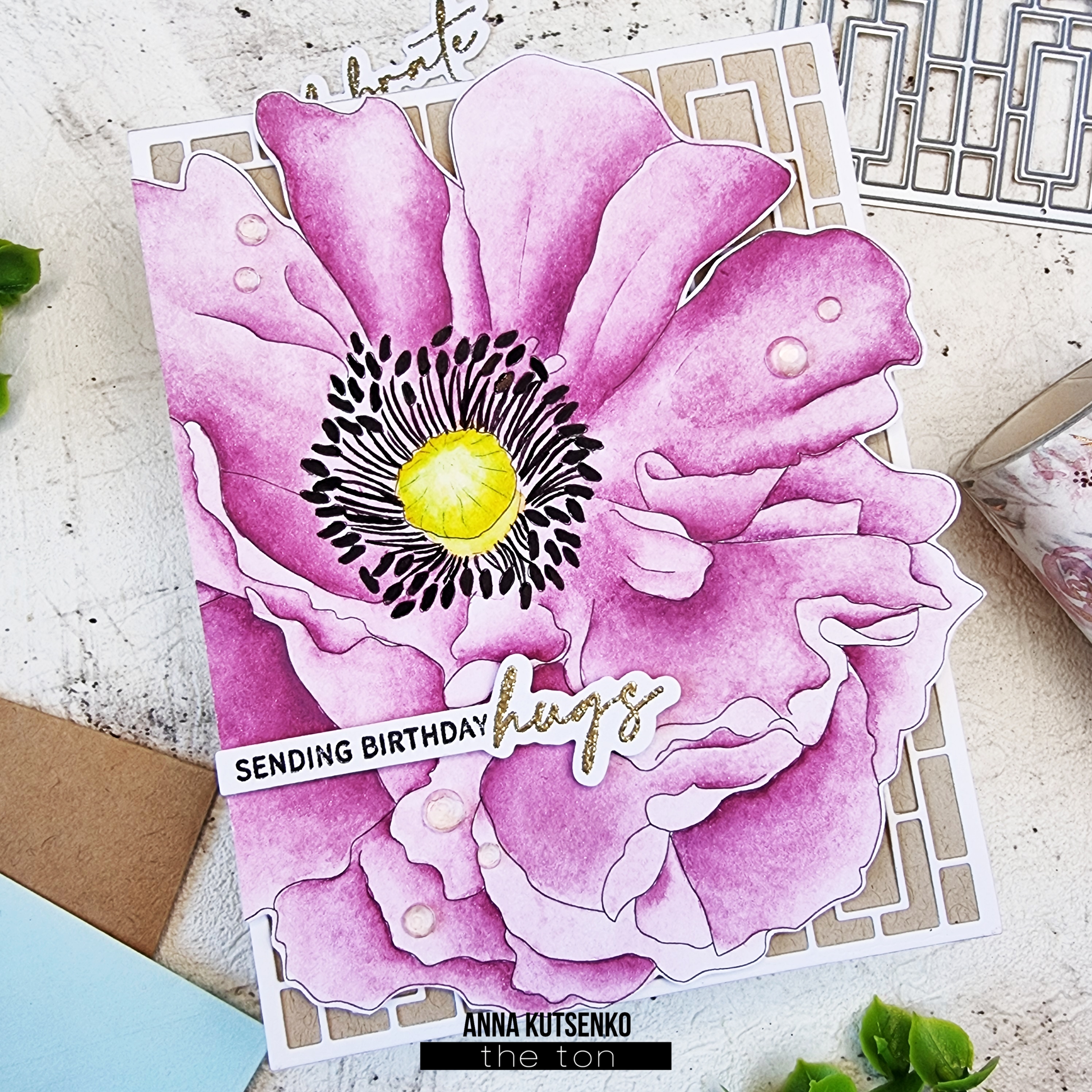 I started by coloring the beautiful poppy using my Holbein watercolors. Then, I fussy cut the flower. To make the background, I cut out a white cardstock panel with Convention Coverplate Die. Next, I adhered it on a sand cardstock panel that was cut out with the largest die from Rectangle A2 Nested Dies.