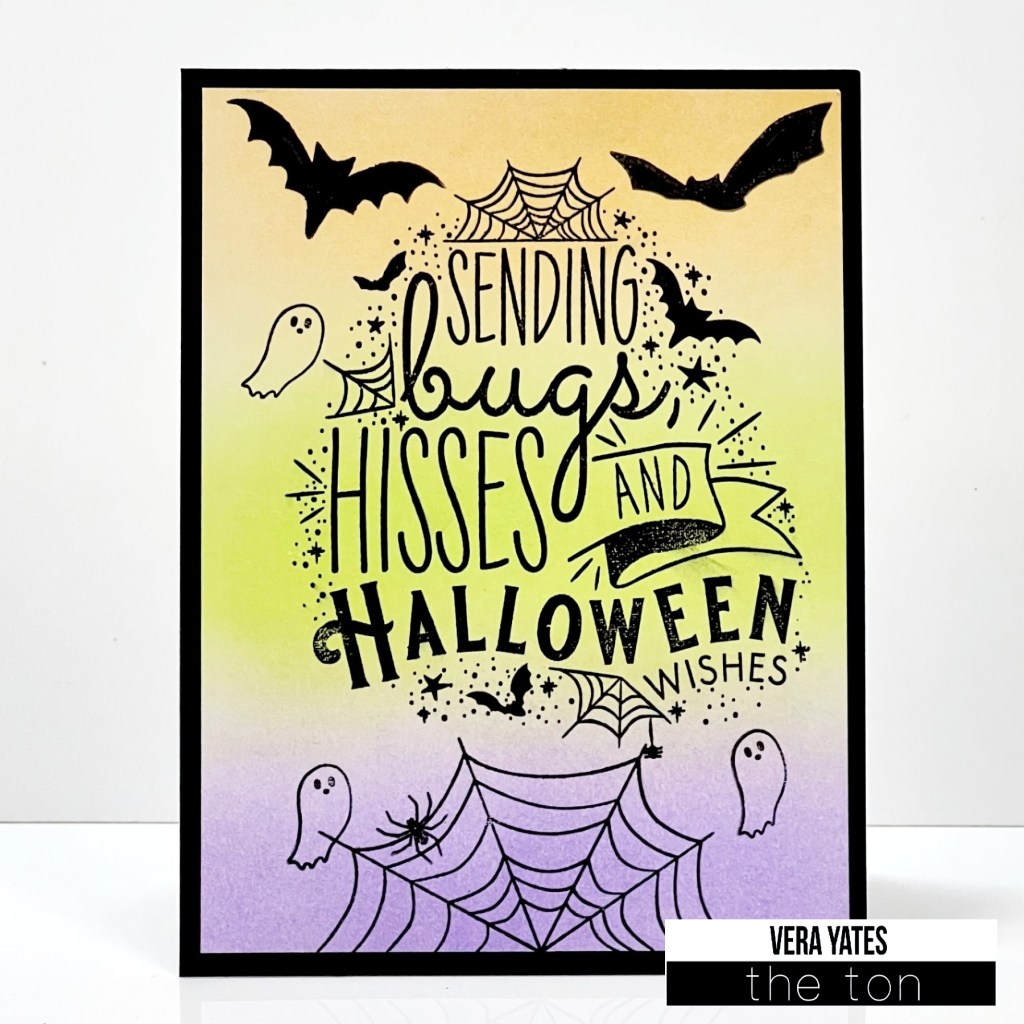 This card is actually come together pretty quick. I first stamped the sentiment, followed by the web, bat and ghosts. Then, I simply ink blending Iris Blooms, Soft Garden & Beach Blondie for the background. That’s it. Seriously, a super quick card.
