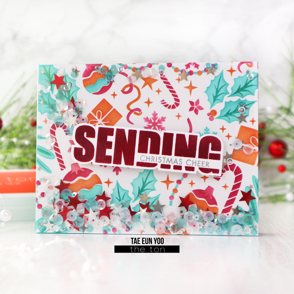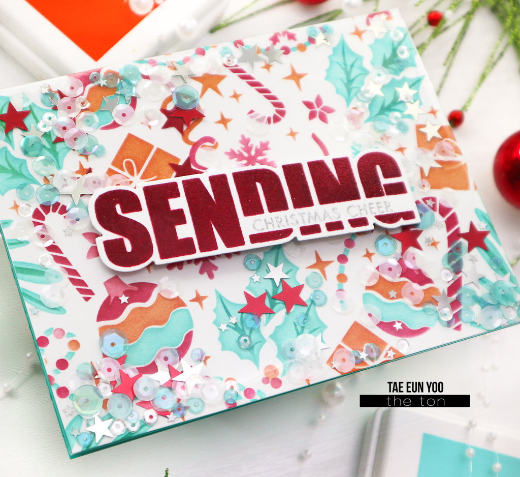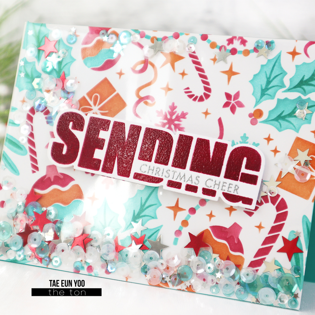 Hello everyone! Hope your week is off to a great start! It’s TaeEun here today with a pocket shaker holiday card! I used one of the four A2 images from the Jolly Season Large Stencils for the background of my pocket shaker card.